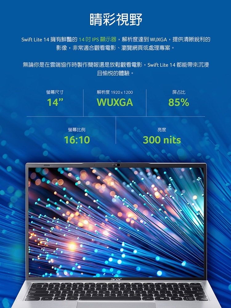 | 螢幕解析度 | 14.0" IPS/16:10/霧面/LED背光<br/>WUXGA 1920 x 1200<br/>NTSC 45%<br/>300 nits |