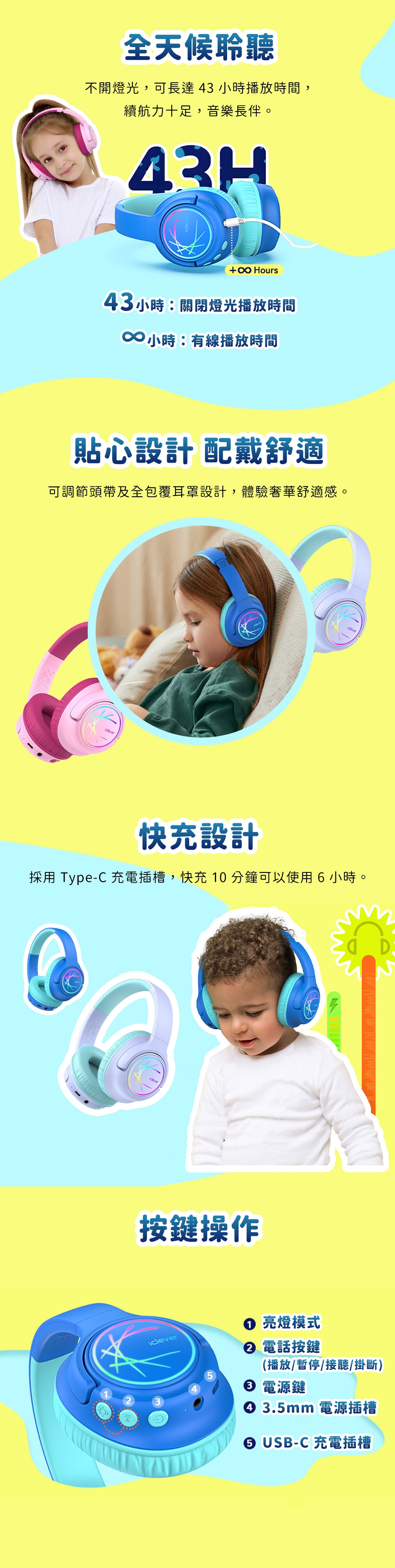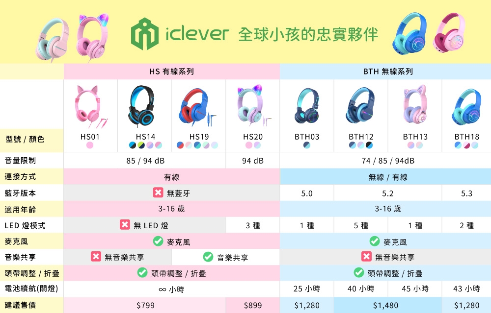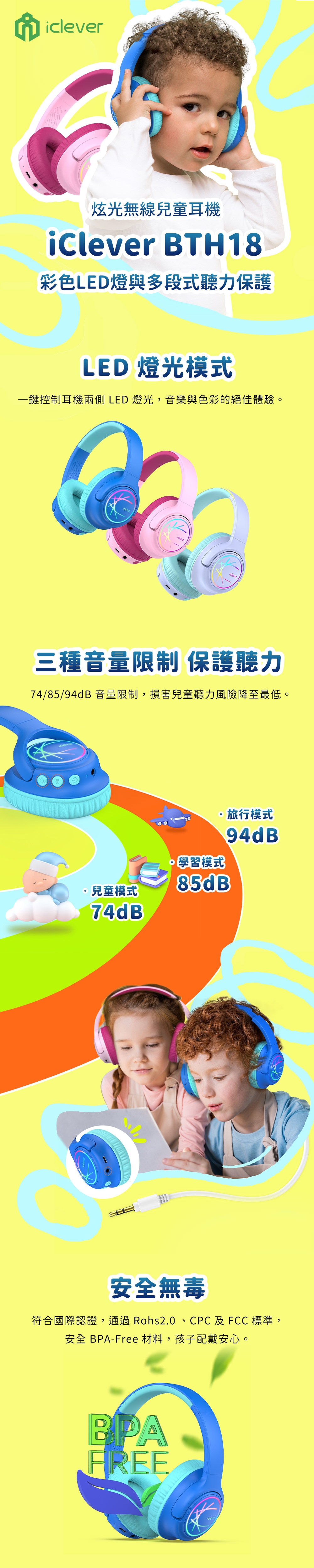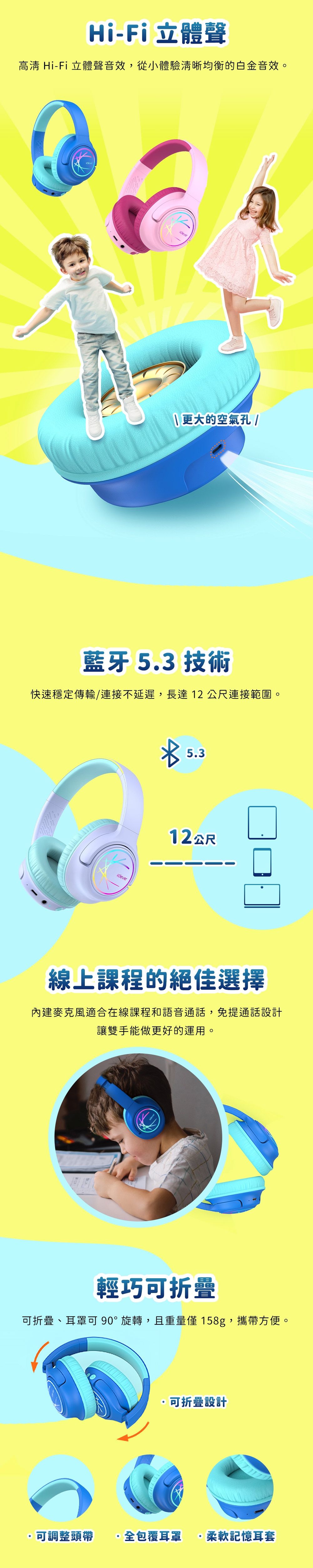 iClever BTH12 炫光無線兒童藍芽耳機 頭戴式 安全音量 藍芽5.2 適用3-16歲 173g輕盈