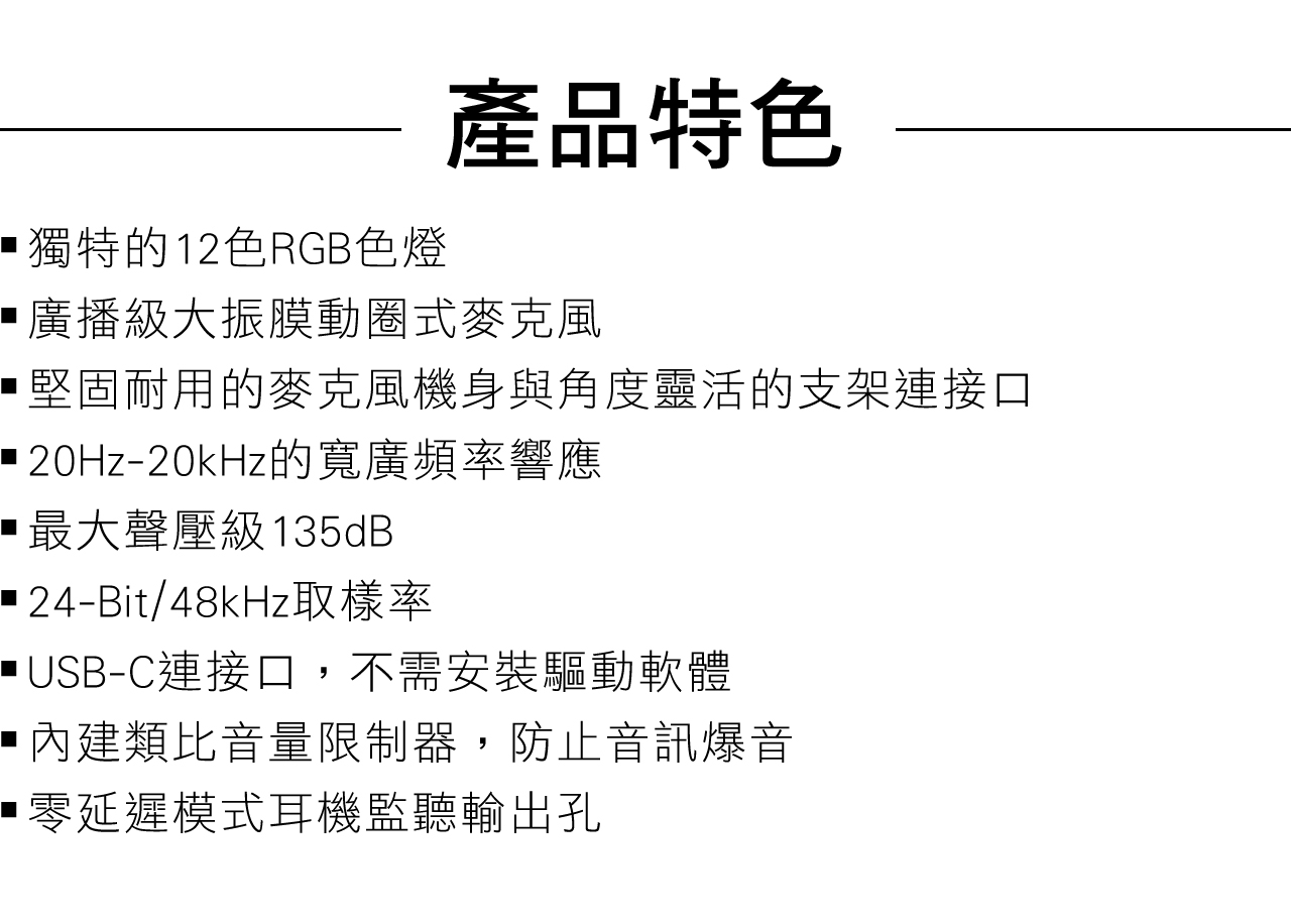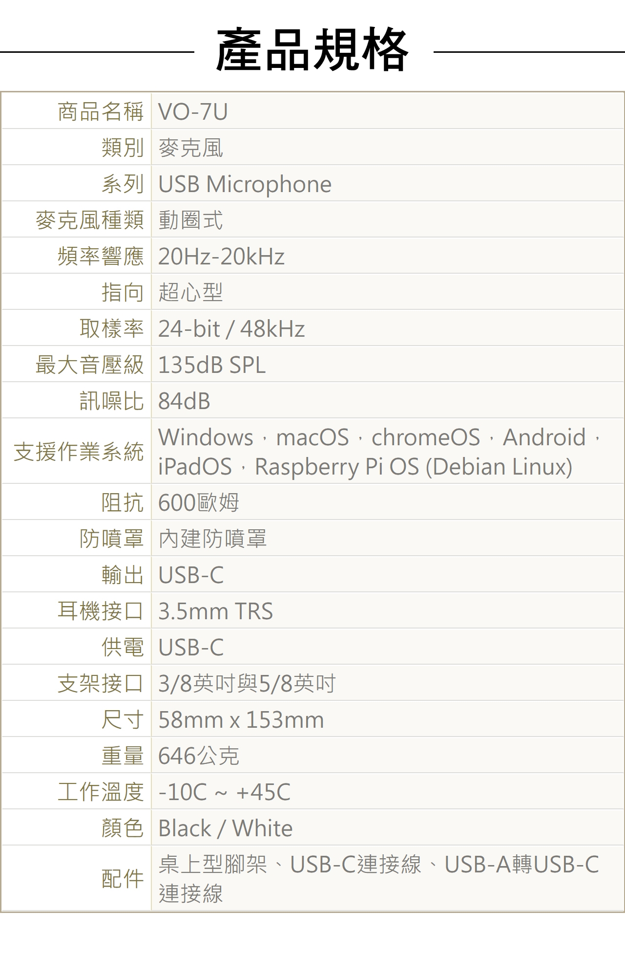 | 配件 | 桌上型角架、USB-C連接線、USB-A轉USB-C連接線 |