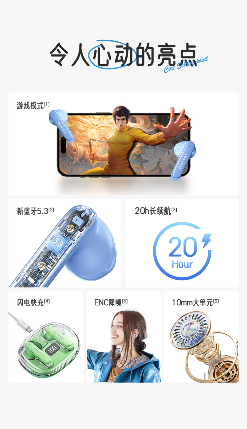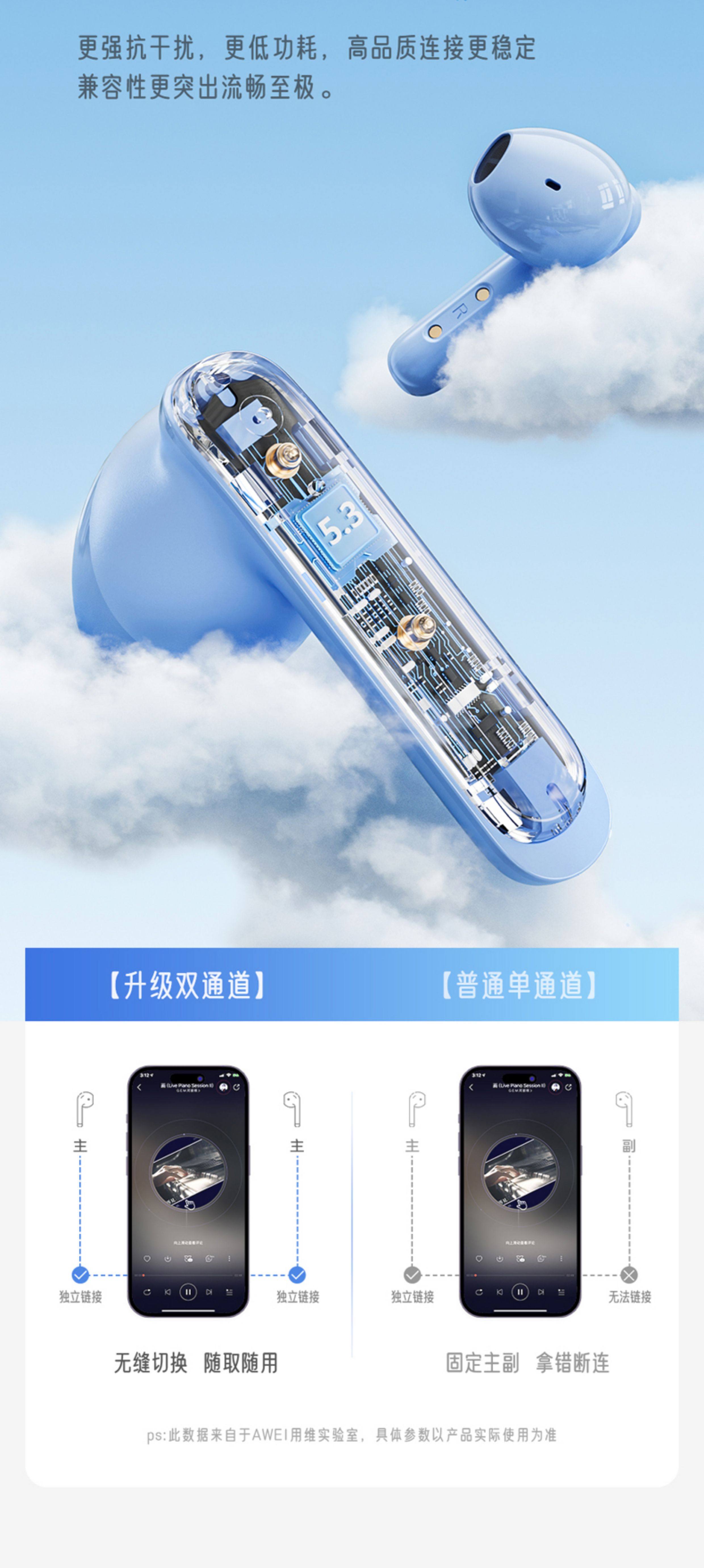 Awei T86(型號T86ENC)是品牌Awei/用維出品的中國大陸產地無線藍芽耳機,採用藍芽5.3版本,提供穩定藍芽連線。半入耳式設計,小巧輕便,支援高畫質通話功能,適合日常通話與音樂播放,帶來清晰音質與舒適佩戴體驗。