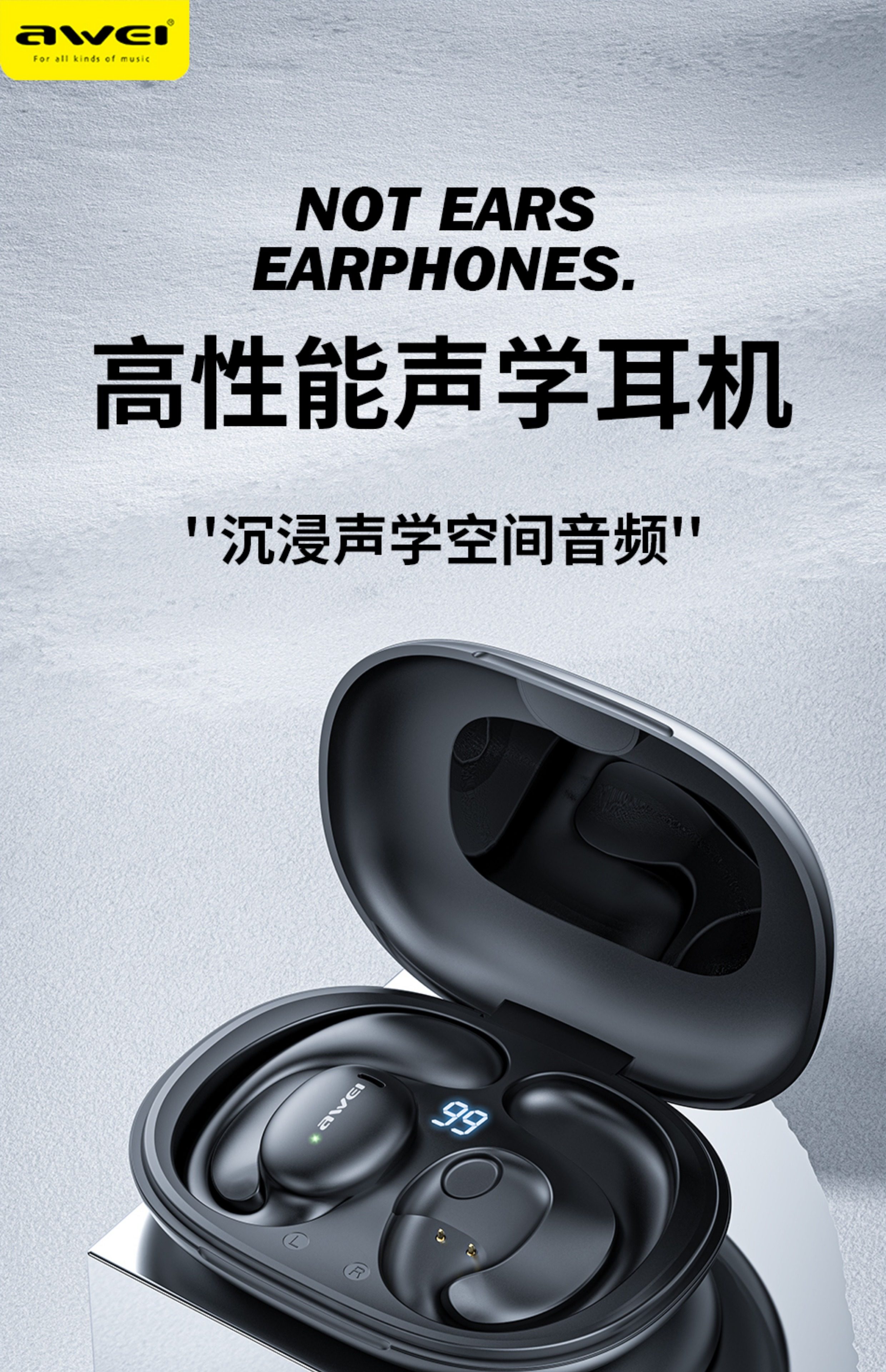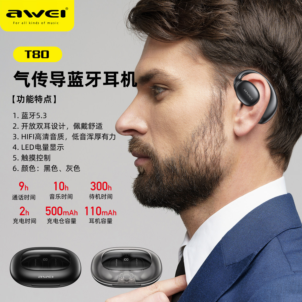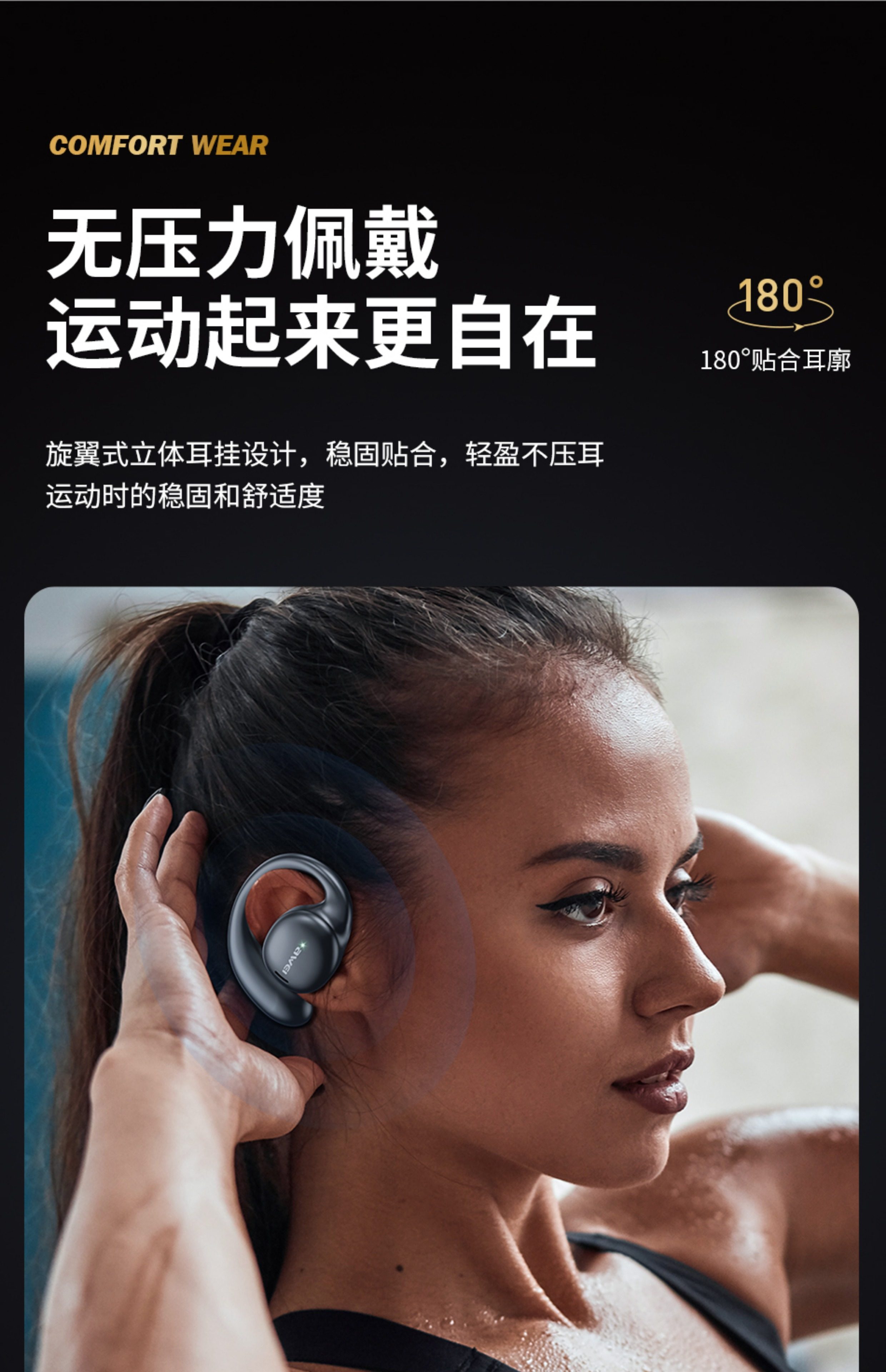 AWEI T80 骨傳導藍芽耳機 5.3版本 耳掛式通話功能 帶電量顯示安全衛生耳機