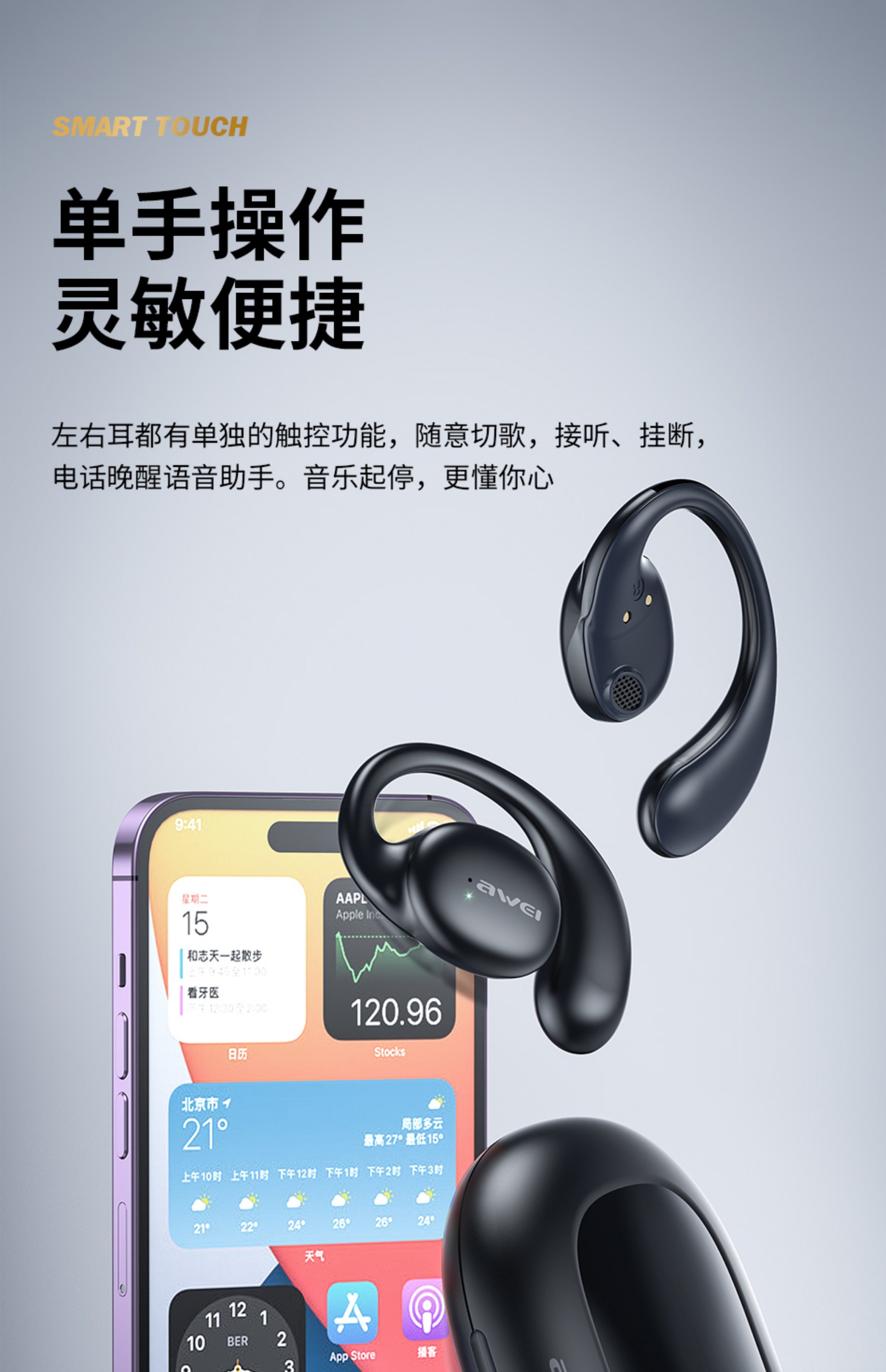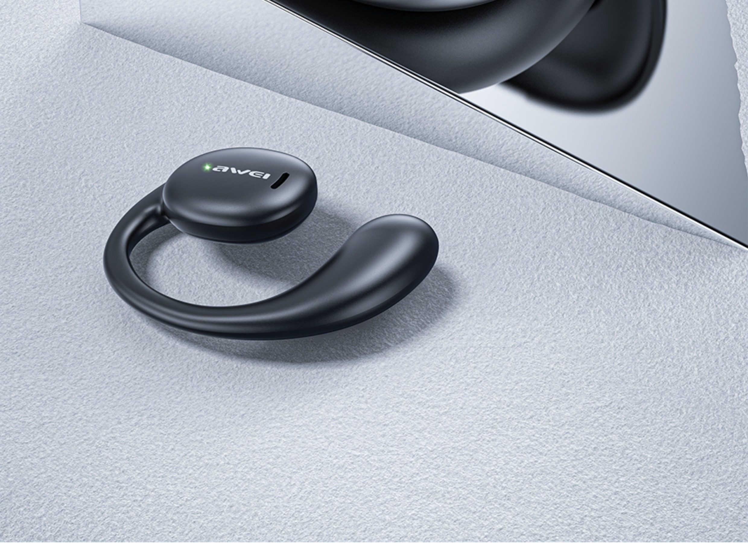 AWEI T80 骨傳導藍芽耳機採用先進的5.3藍芽技術,提供穩定無線連線與通話功能。耳掛式設計確保運動時穩固佩戴,骨傳導技術讓您邊聽音樂邊感知周圍環境,提升安全性。內建電量顯示功能,中國大陸原產品牌Awei,適合跑步、騎行等戶外活動使用,衛生耐用。