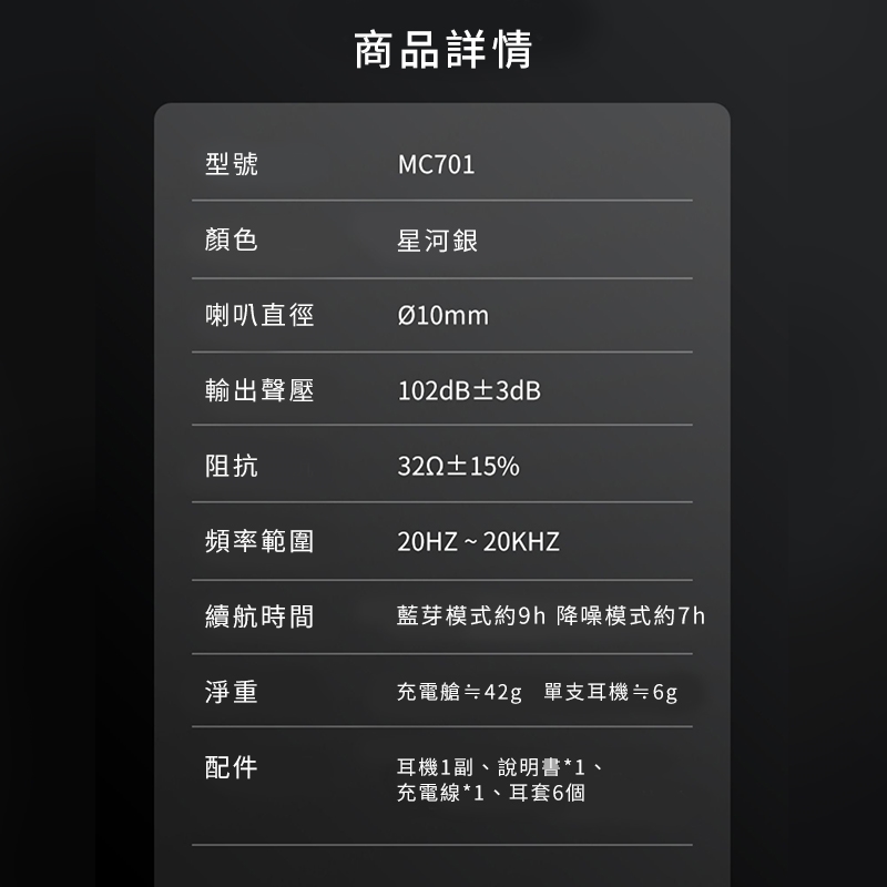 | 內容物 | MC701耳機 x1、使用手冊 x1 |