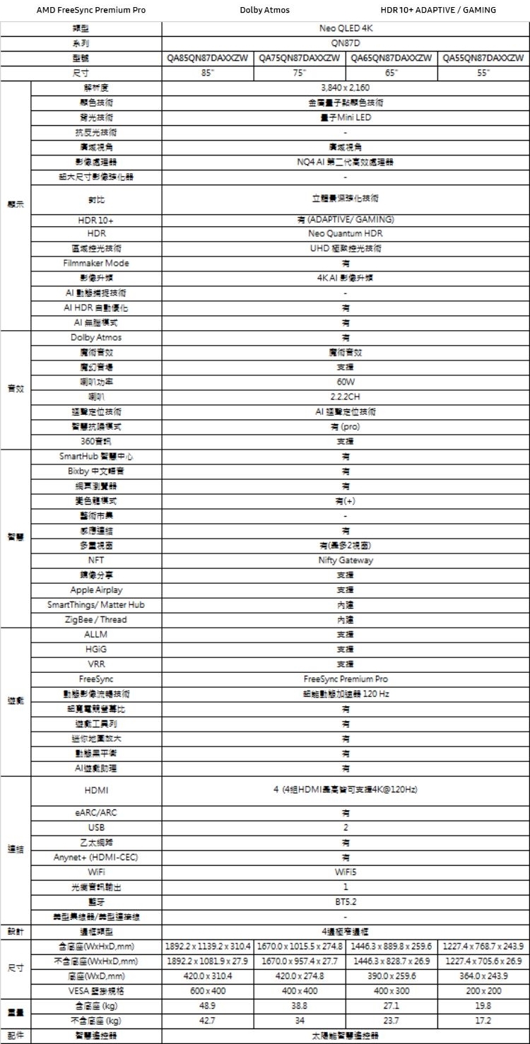| 商品名稱 | (含標準安裝)三星55吋4K連網Neo QLED智慧顯示器QA55QN87DAXXZW分享送500 |
