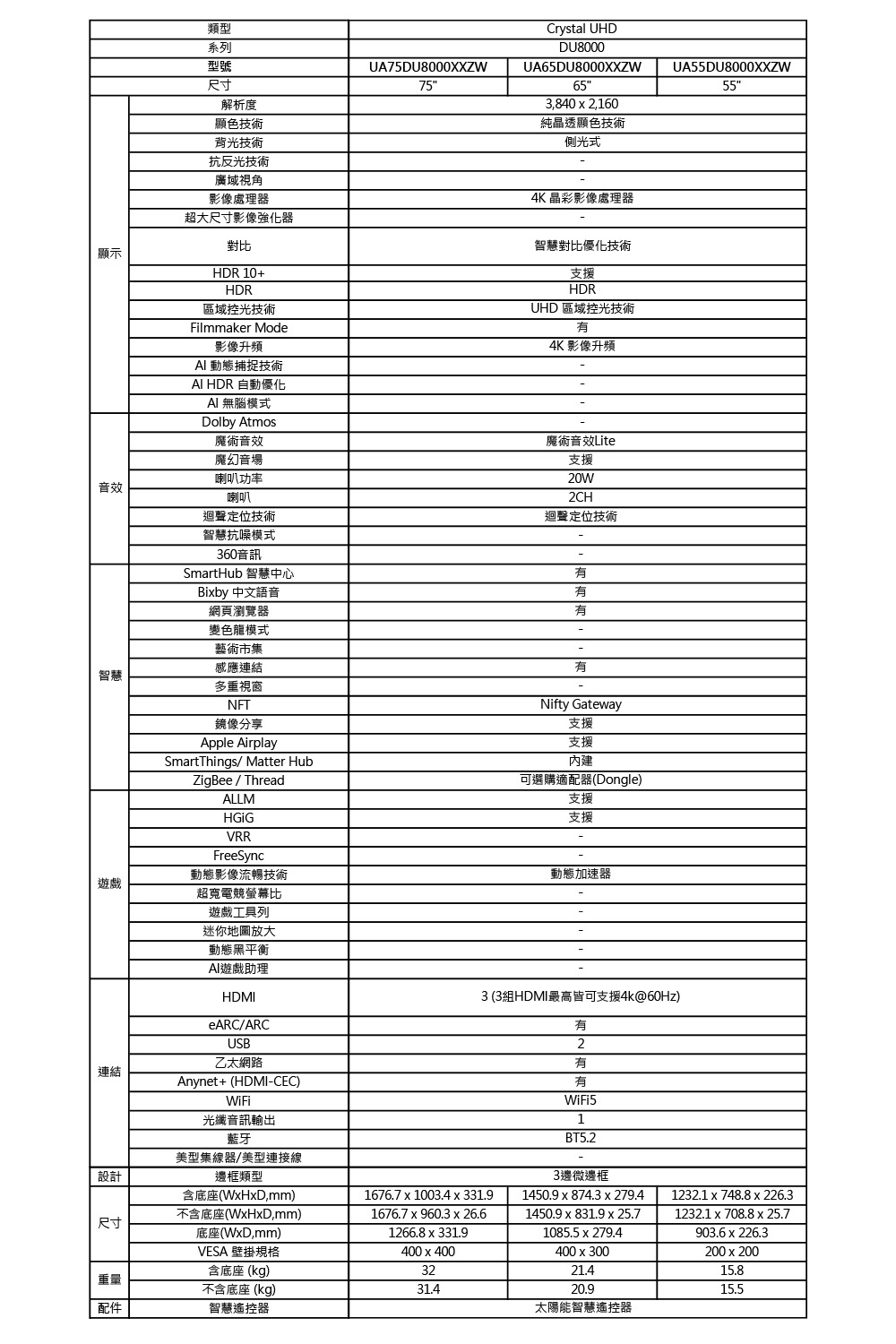 | 型號 | UA55DU8000XXZW、55DU8000XXZW、55DU8000 |