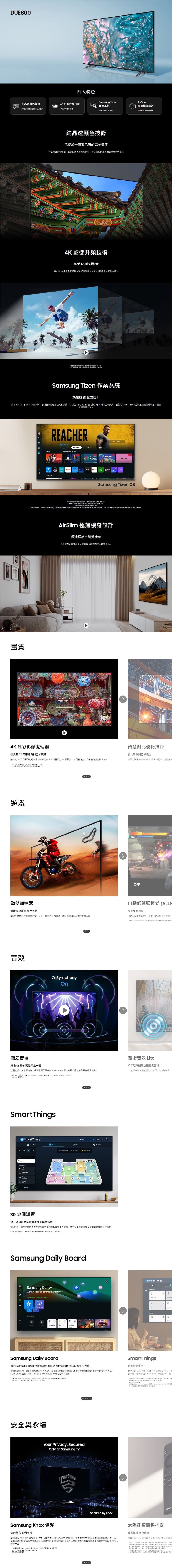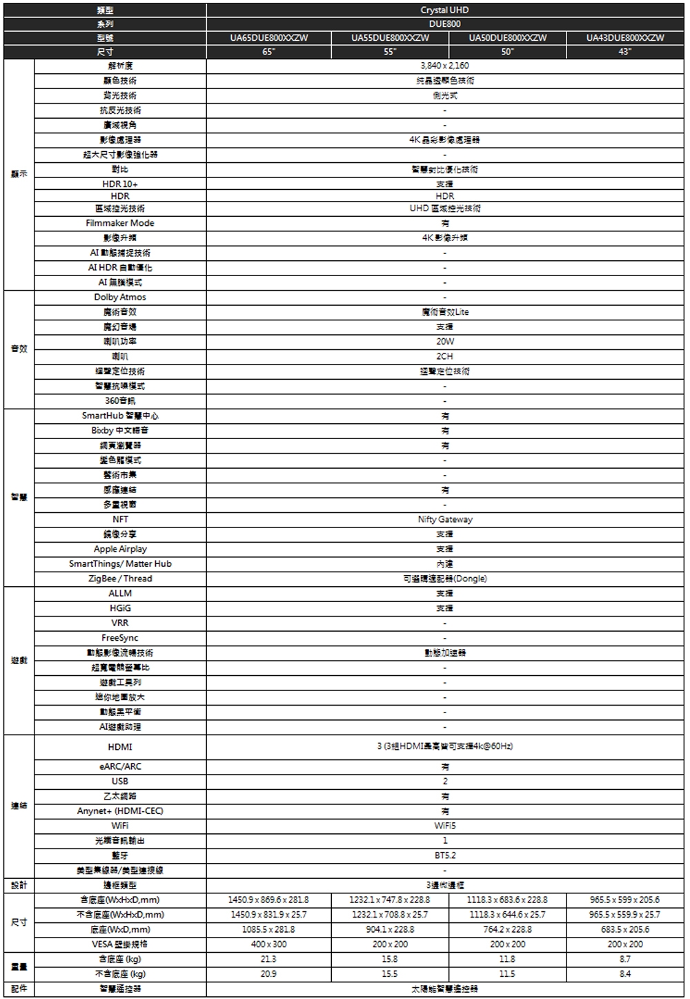 SAMSUNG 三星 UA55DUE800XXZW 55吋 4K UHD 解析度 (3840 x 2160) 智慧電視,越南製造,提供 2 年保固。支援 60Hz 倍頻、HDMI 高畫質數位影音端子 3 組、USB 插槽 2 組,功能選單語言包含中文,電源需求 110V。無附視訊盒,適閤家庭娛樂使用,畫質細膩色彩鮮豔。規格以實物為準,如有變動恕不另行通知。
