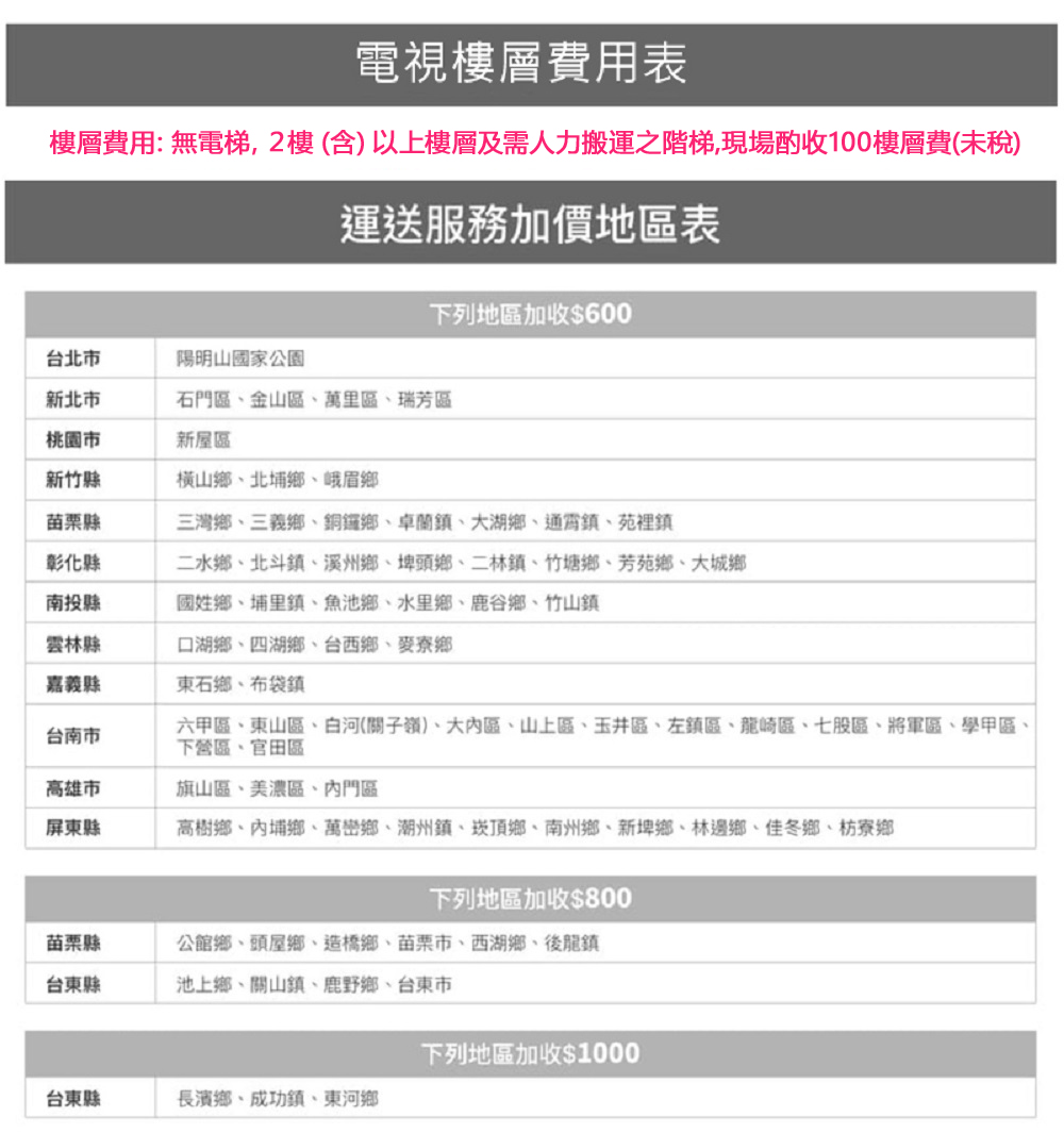 | 配件 | 電視本體.腳架*2.腳架螺絲.保固卡.說明書.電源線.遙控器.電池 |