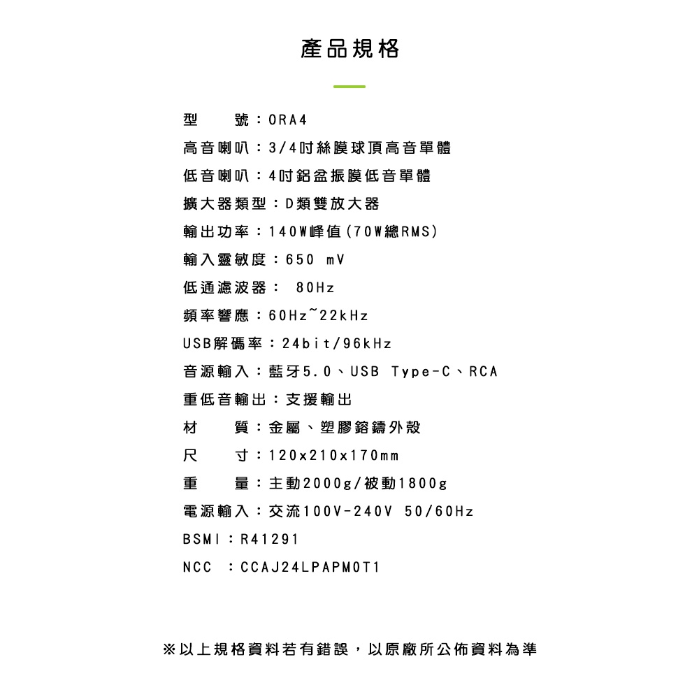 | 音源輸入: | 藍牙5.0、USB Type-C、RCA |