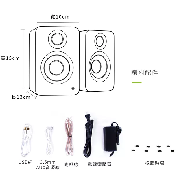 | 配件 | 喇叭線、3.5mmAUX音源線、USB線、變壓器、橡膠貼腳、說明書。 |