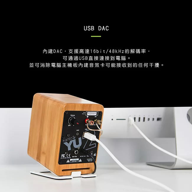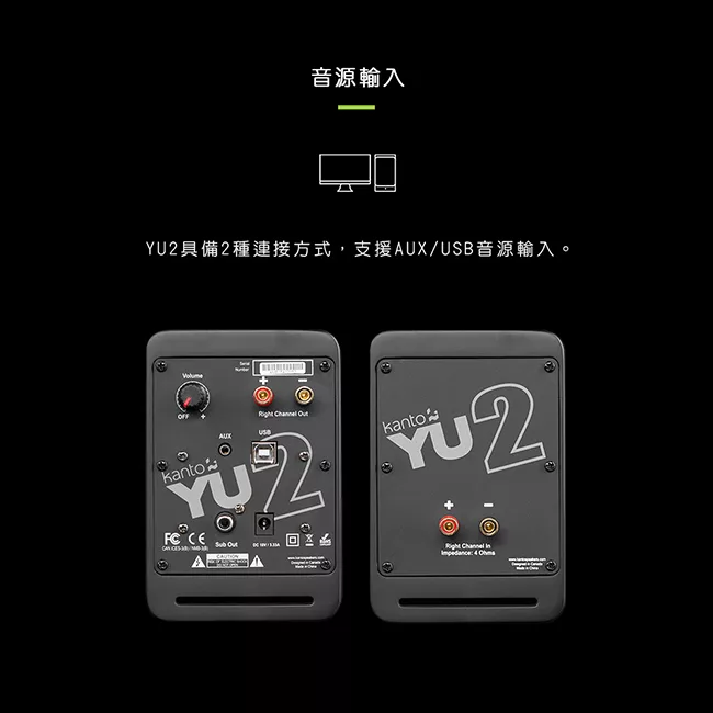 Kanto YU2 是一款專業書架型喇叭,適合電腦、多媒體及劇院使用。採用3/4吋Silk Dome高音單體與3吋Kevlar®低音單體,提供80Hz~20kHz頻率響應及25W x 2 RMS輸出功率。支援USB輸入(最高16bit/48kHz)及3.5mm AUX,具SUB OUT低音輸出埠。MDF木質箱體設計,防振橡膠腳,尺寸100x135x150mm,輕巧易置放。中國製造,BSMI認證R41291,1年保固。完美升級您的桌面音響體驗,享受清晰立體聲。