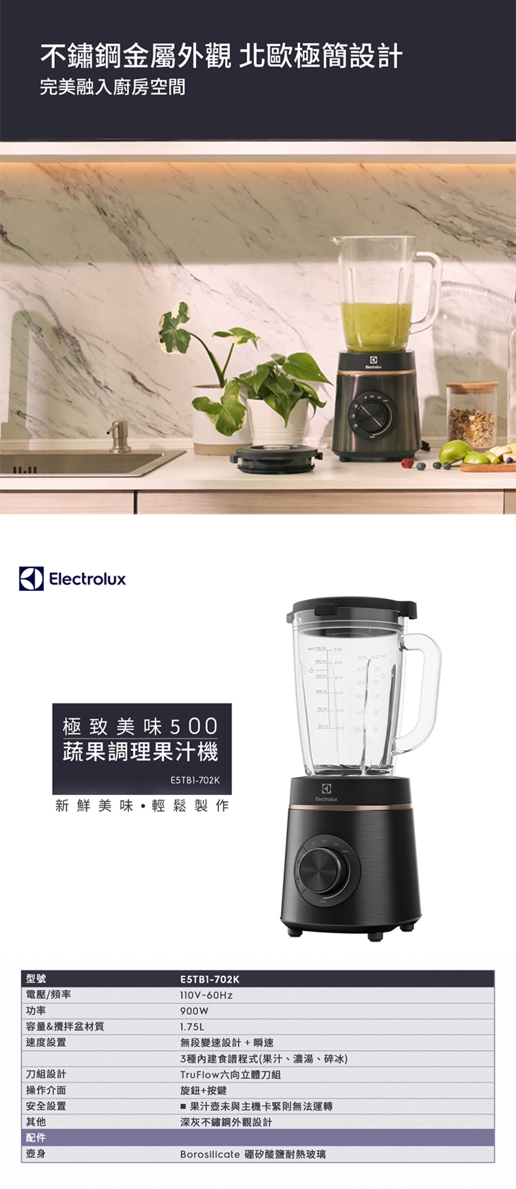 | 商品名稱 | Electrolux伊萊克斯 極致美味冰沙果汁機E5TB1-702K |
