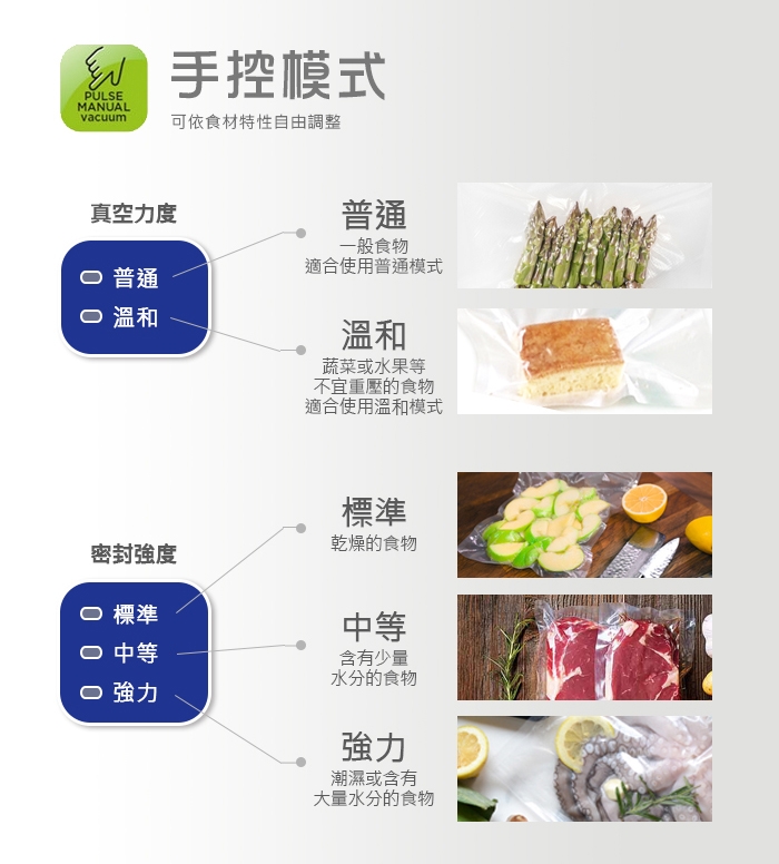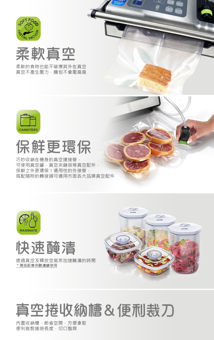| 特殊功能 | 醃漬模式, 真空調速, 防壓碎快速封口 |