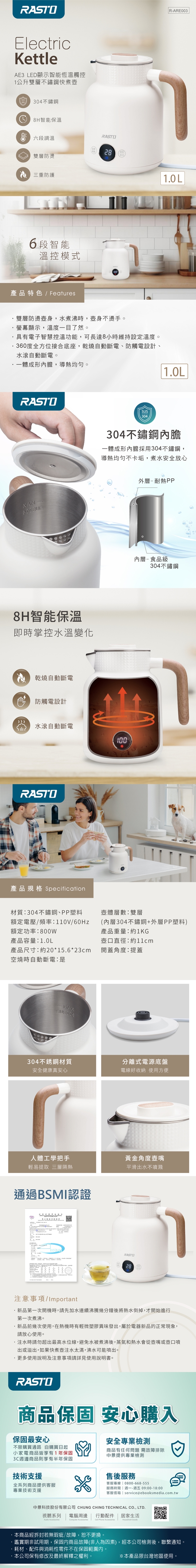RASTO AE3 電熱水壺(型號R-ARE003)容量1公升以下,採用304不鏽鋼內膽,電壓110V/60Hz,消耗功率700~800W,尺寸20x15.6x23cm,重量僅1050g。中國製造,提供1年保固及BSMI許可字號R53771。快速沸騰、安全耐用,適閤家庭辦公室使用,提升您的煮水效率。