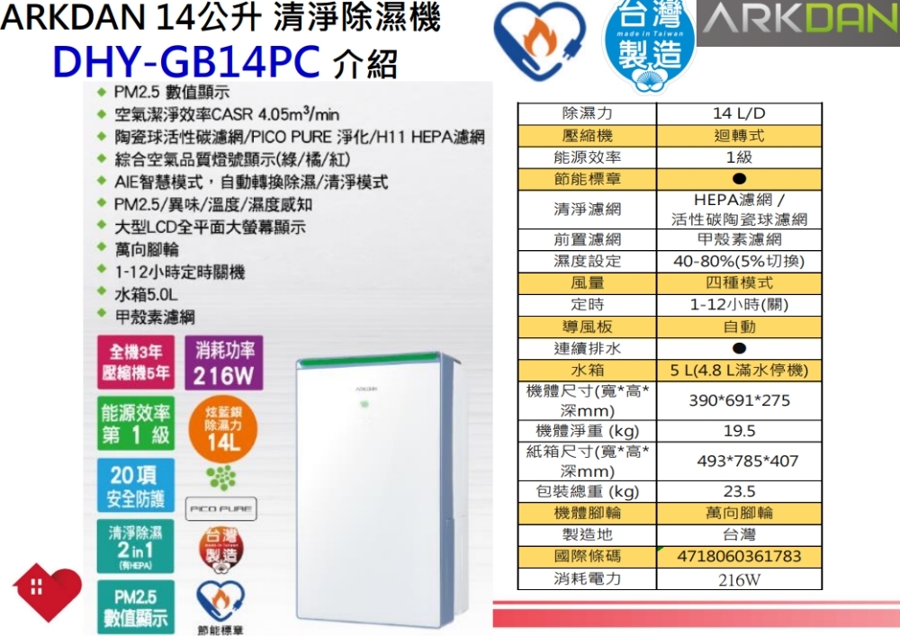 ARKDAN DHY-GB14PC 除濕機,臺灣原廠製造,12L除濕量適合5~10坪空間使用。水箱容量5L以上,支援連續排水管接駁,定頻馬達搭配環保冷媒,噪音低、能源效率第一級。機身尺寸390x691x275mm,重量19.5kg,白色系設計,配備集塵濾網,保固1年,BSMI認證R41A01,高效除濕防潮首選。