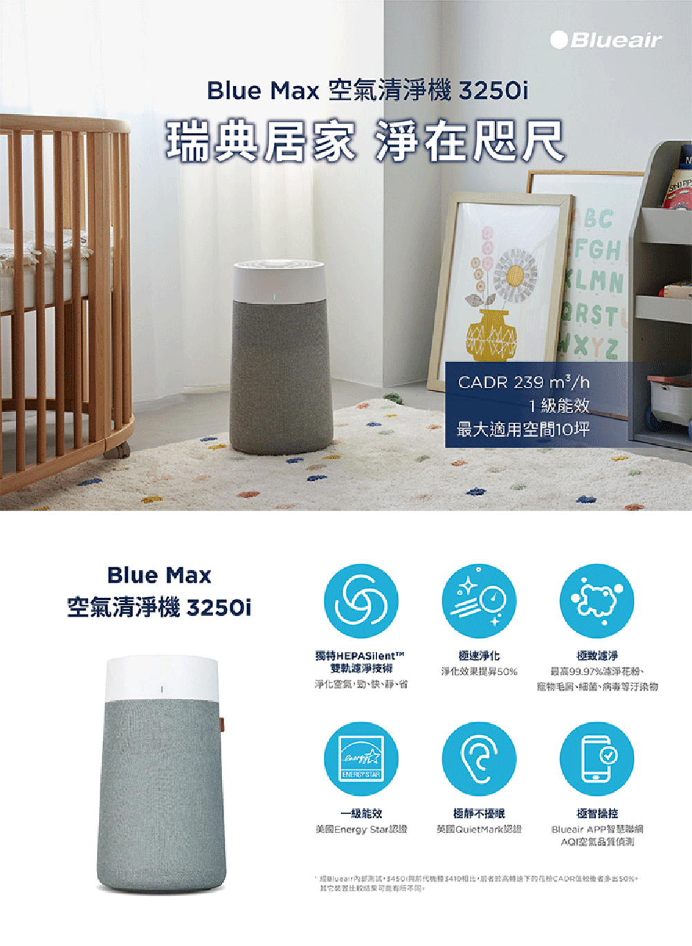 Blueair 3450i Blue Max系列空氣清淨機 HEPA活性碳濾網 適用30坪低噪音節能環保去除過敏原病毒1,188