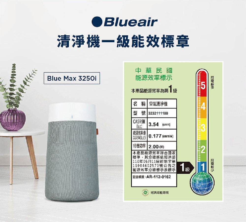 Blueair 3250i 空氣清淨機,採用活性碳濾網 Filter Blue 3250 PAC,白色系設計,尺寸481 x 269 x 269 mm,機重3.39kg,適用10坪空間。噪音18~46dB,低功耗20W,能源效率第一級,電源100-240VAC,中國製造,保固1年,BSMI R3C408,附保證卡,提供高效淨化與靜音舒適環境。