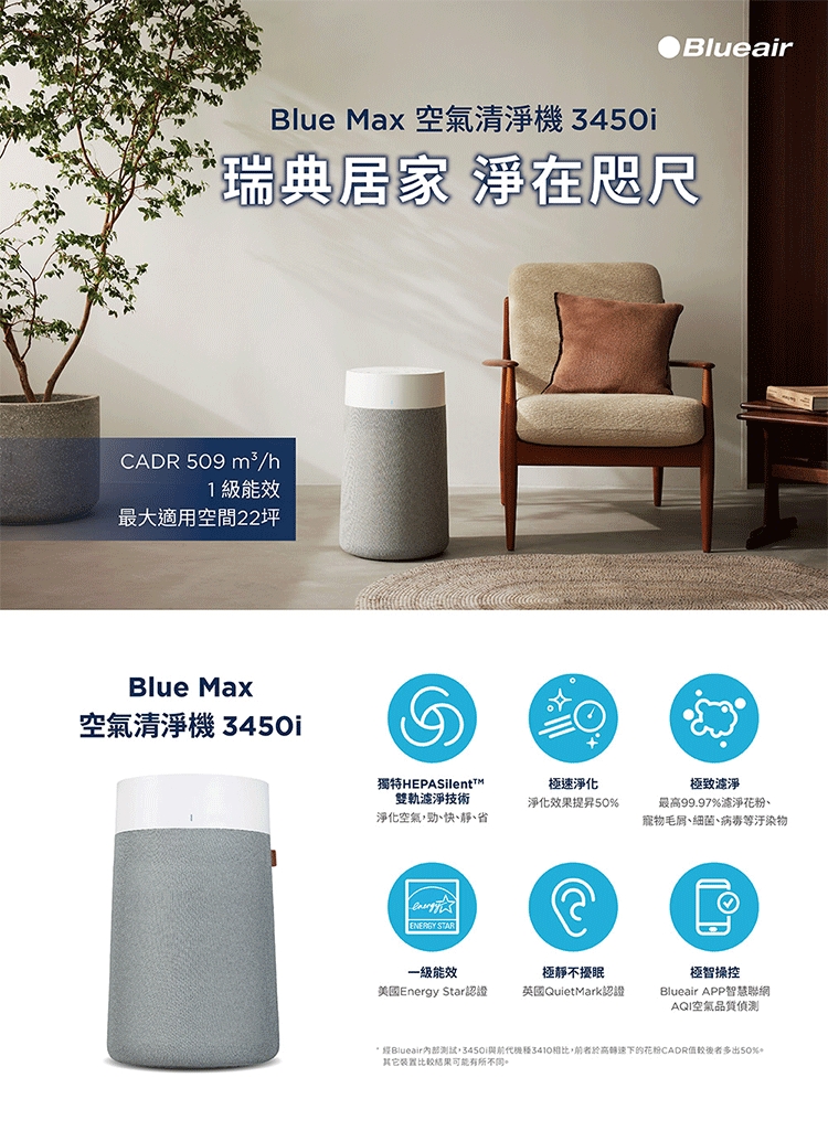 | 商品名稱 | Blueair BlueMax空氣清淨機3450i(適用坪數22坪) |