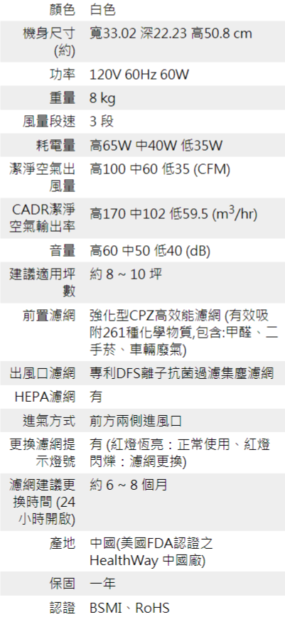 HEALTHWAY 10600 HEPA空氣清淨機 白色高效過濾 適用8-10坪空間 1年保固