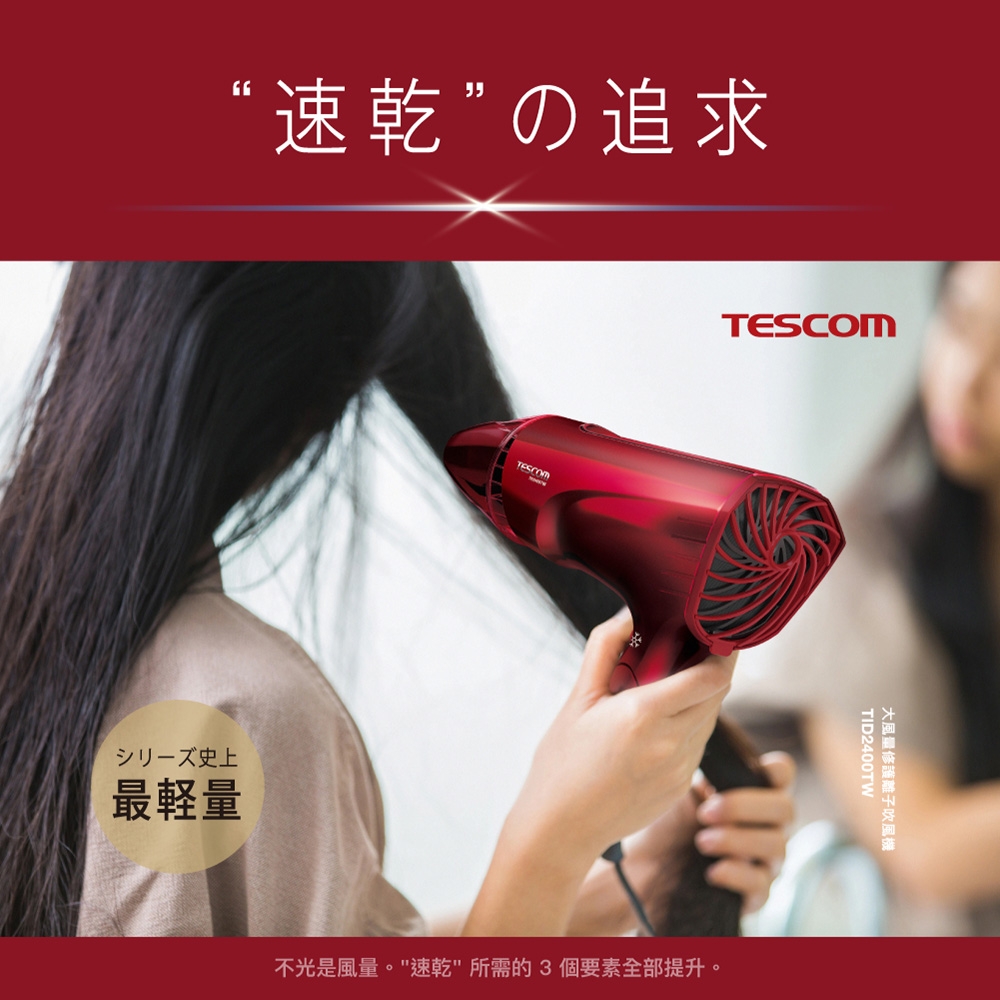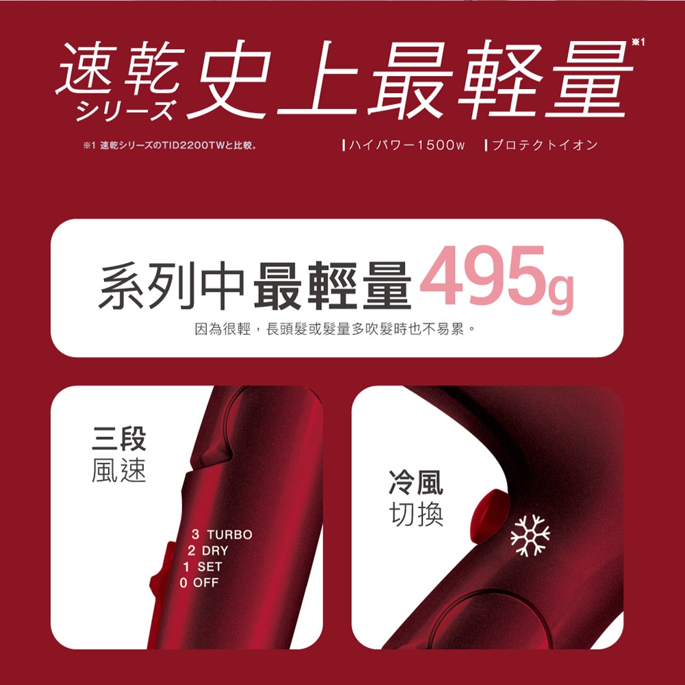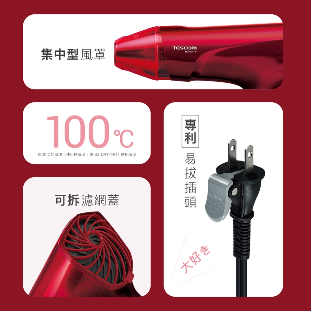 TESCOM TID2400TW 紅色系負離子吹風機 可折疊三段風速1500W 速乾護髮神器