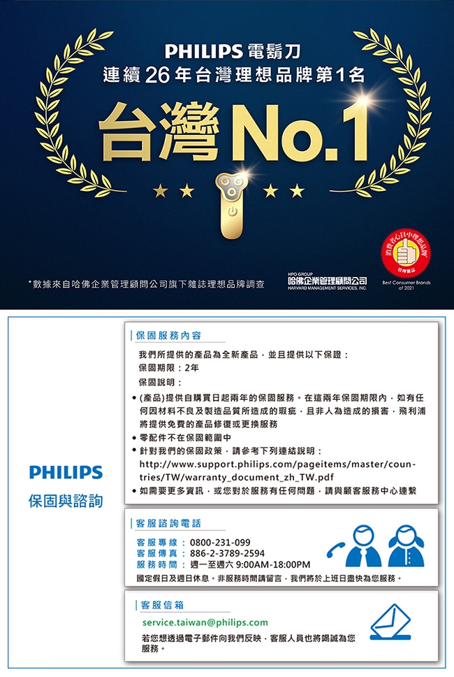 | 飛利浦客戶服務專線 | 0800-231-099 (週一至週六 09:00 - 18:00) |