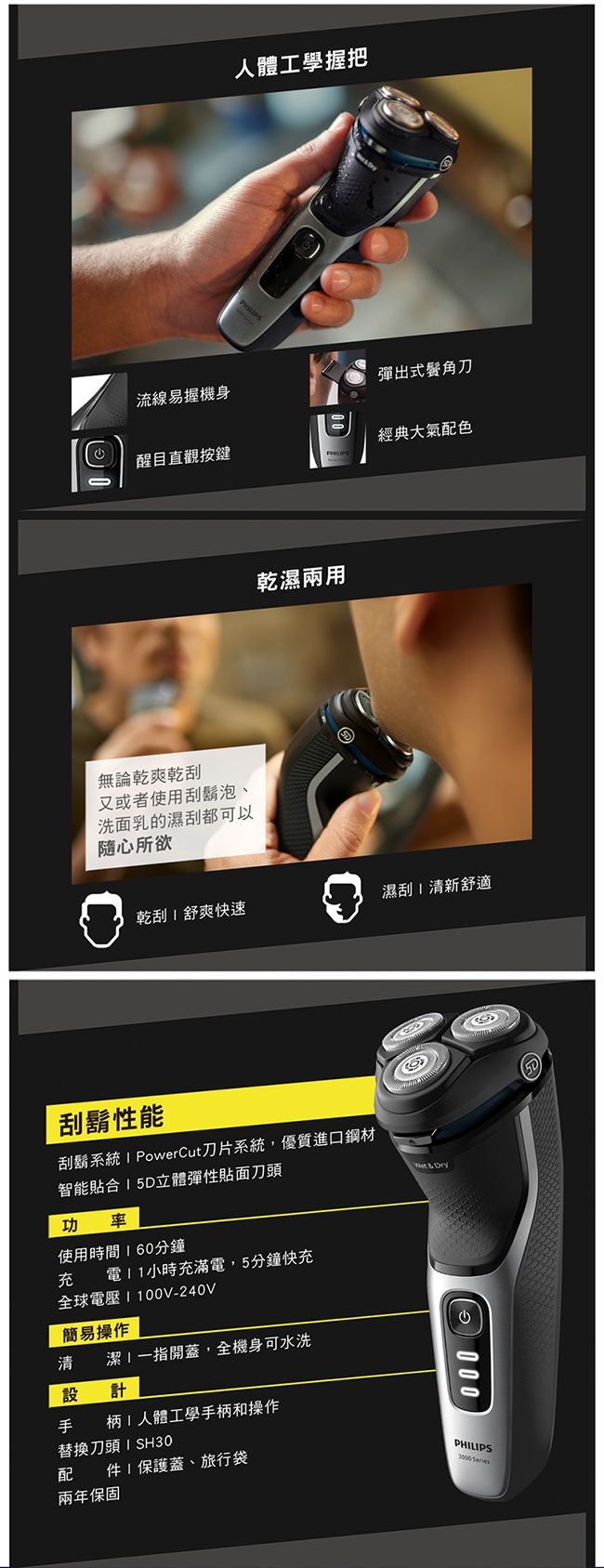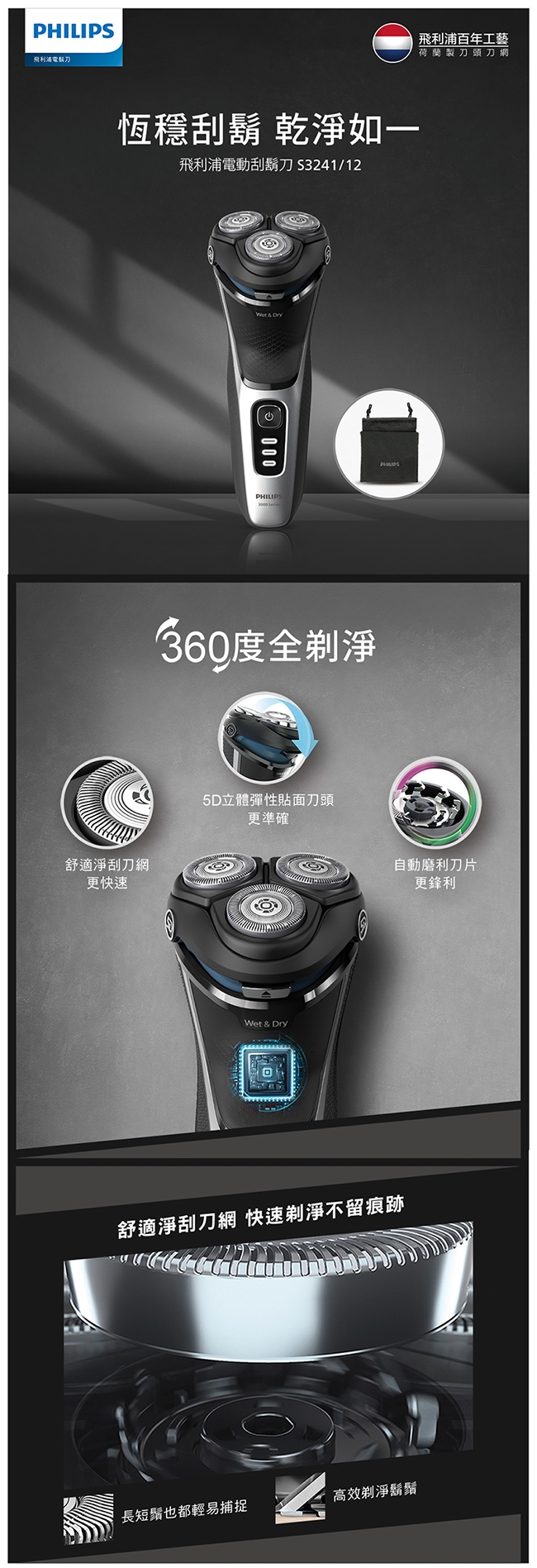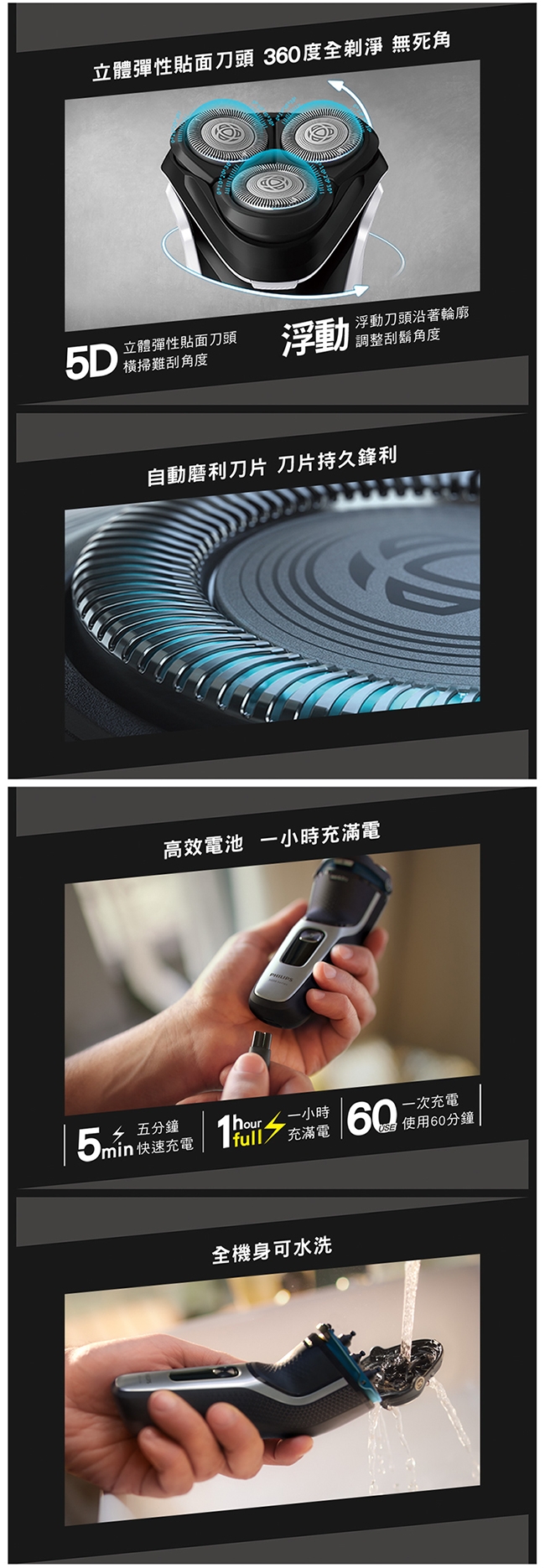 | 特殊功能 | 刀頭浮動設計, 鬢角修剪器, 電量顯示 |