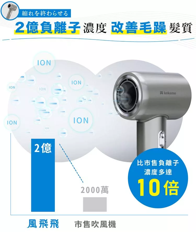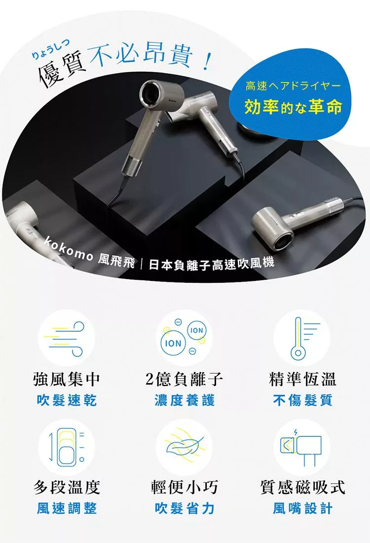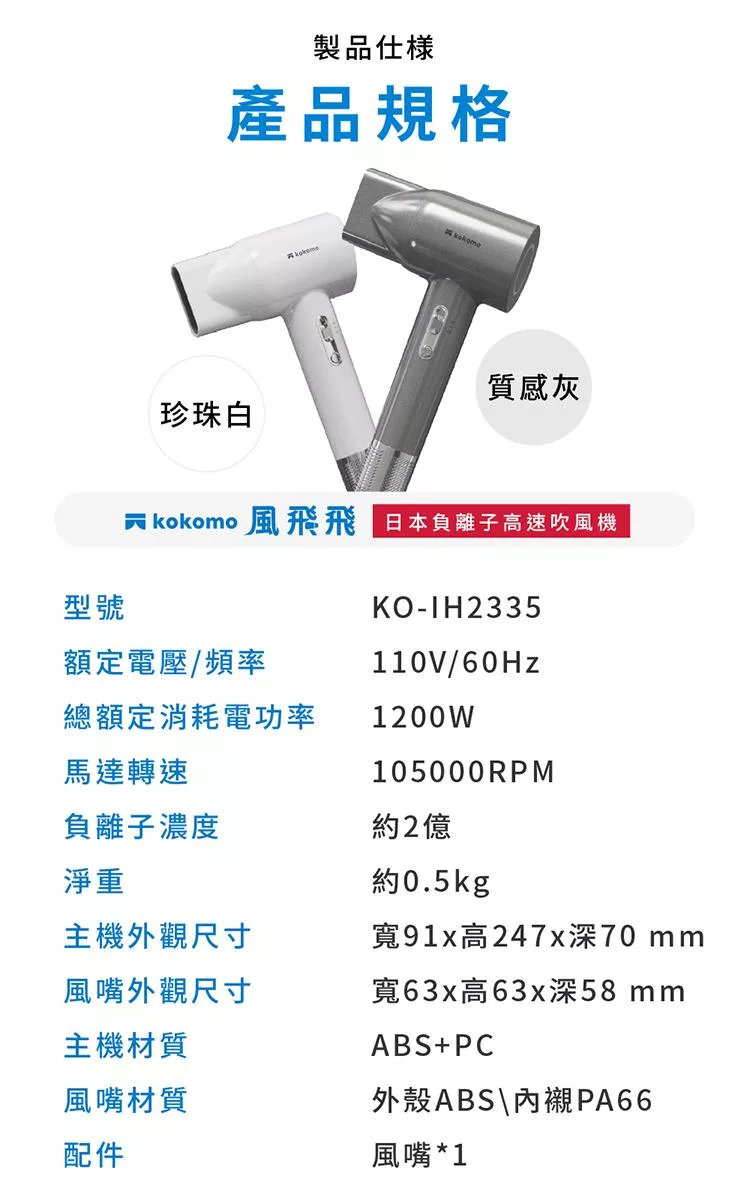 | 商品名稱 | kokomo風飛飛 日本負離子高速吹風機 KO-IH2335 灰銀色 / 珍珠白 |