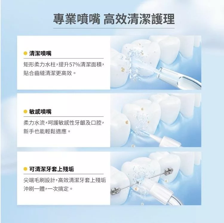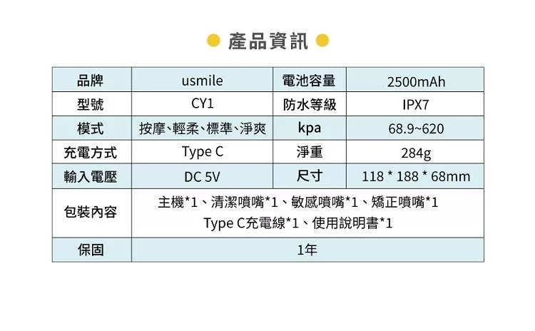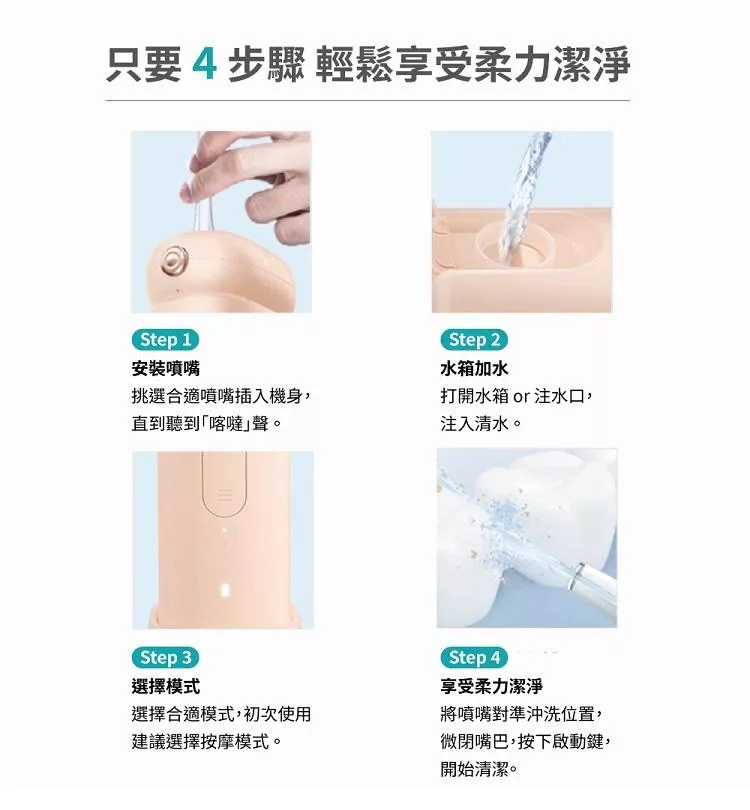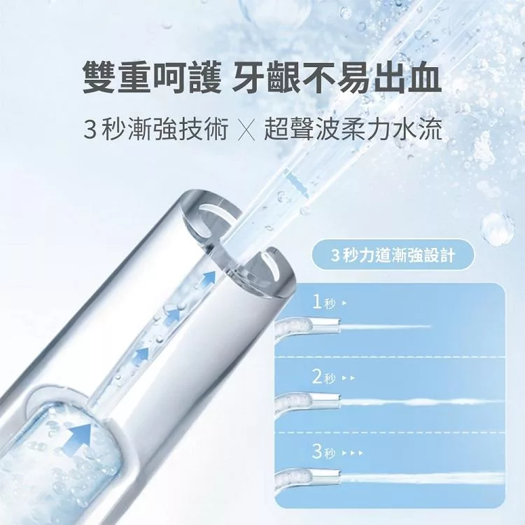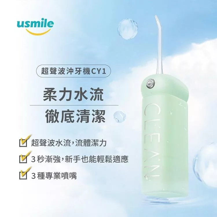 usmile CY1 超聲波沖牙機,採用貼心智慧科技與3秒漸強技術,雙重呵護牙齦不易出血。矩形柔力水柱提升57%清潔面積,徹底清潔齒縫不增大牙縫。一鍵輕鬆切換4大清潔模式,180ml大容量適合居家外出使用。專業噴嘴高效護理,安裝簡易只需插入聽到喀噠聲。