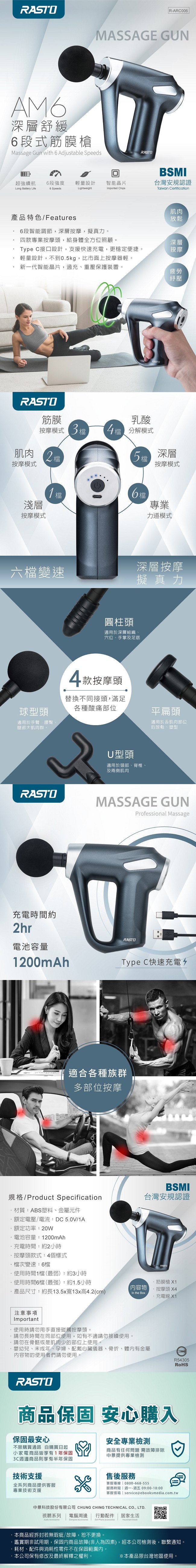 RASTO AM6 筋膜槍是專業肌肉恢復工具,尺寸14x14.2x4.5cm,重量僅414g(不含按摩頭),輕巧便攜。內容包含筋膜槍本體、4款不同按摩頭及充電線,適合深層按摩緩解肌肉痠痛。產地中國,BSMI許可字號R54305,安全可靠。無論運動後恢復或日常放鬆,都能提供強效按摩效果,提升生活品質。