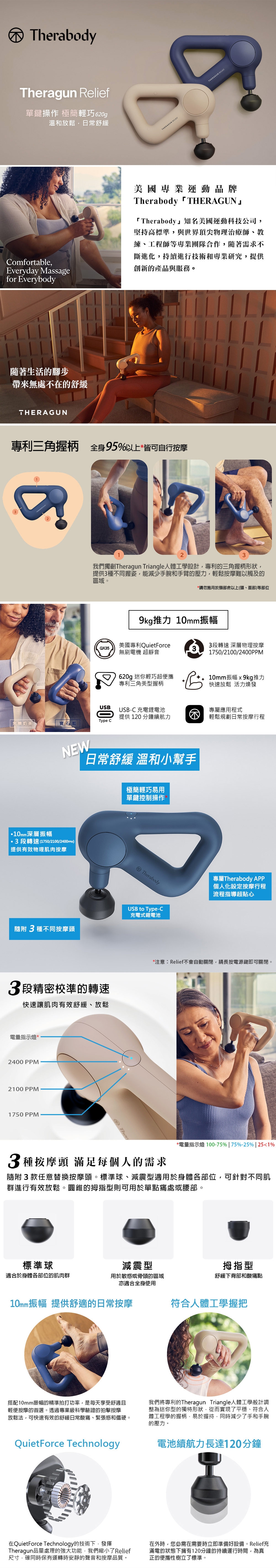 Theragun Relief 專業筋膜槍,採用 10mm 強勁振幅與 1750-2400 RPM 可調轉速,提供深層肌肉按摩與快速緩解痠痛。支援寶石藍與焦糖奶茶兩色選擇,輕巧設計僅 620g,尺寸 21 x 16 x 5.5 cm,便於攜帶。120 分鐘超長續航 USB-C 充電式電源,配件包含標準按摩頭、減震按摩頭、指形按摩頭、充電線與保固卡。中國製造,BSMI 認證 R3E951,適合運動後恢復與日常肌肉保養,是家用按摩的最佳夥伴。