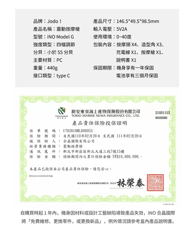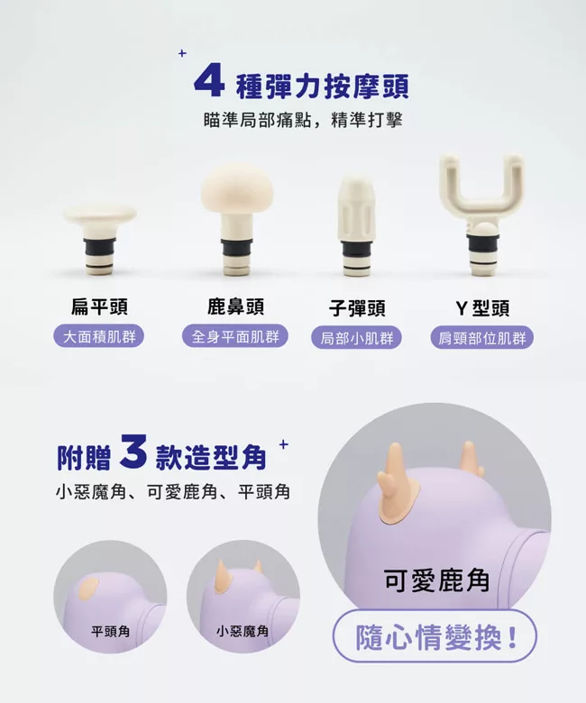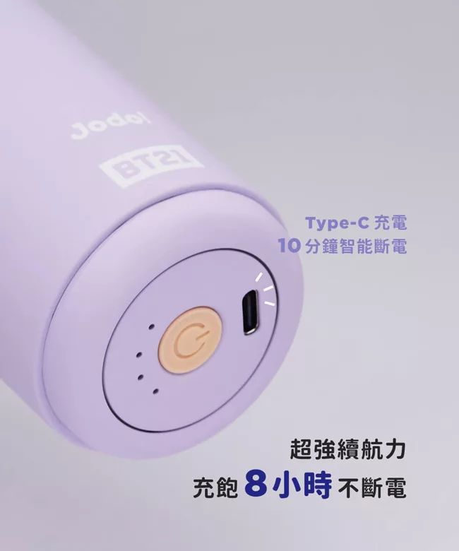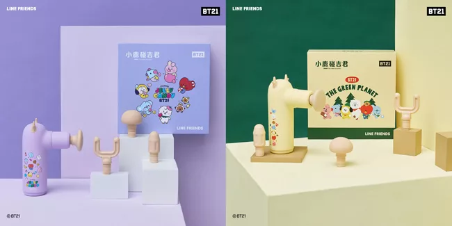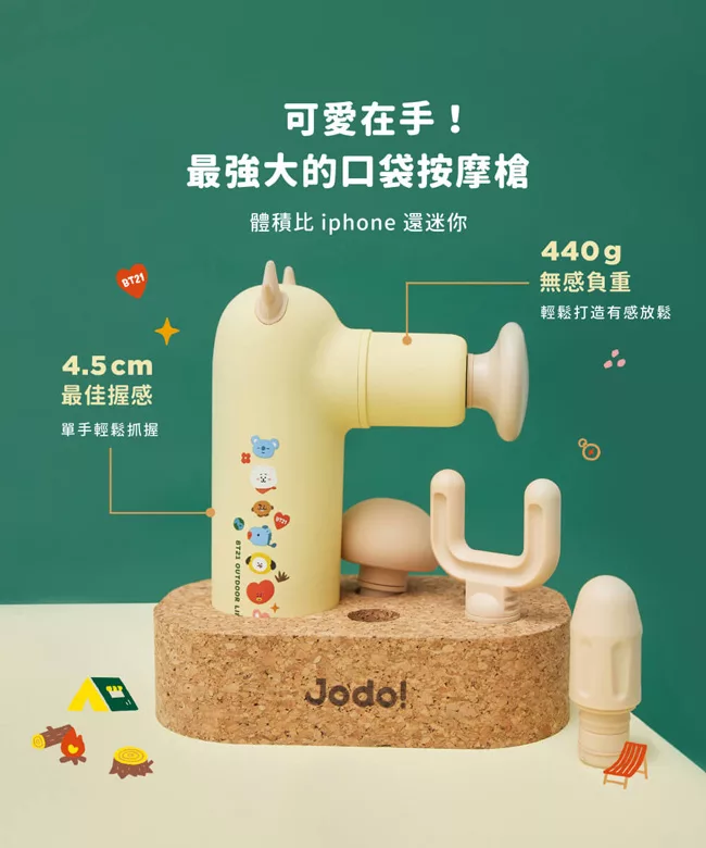 iNO JODO BT21 震動按摩槍,2021 全新 The Green Planet 主題圖案設計,採用獨家磁浮無刷馬達提供穩定強勁動力,運作聲量低於 55 分貝。具備 4 種彈力按摩頭,可針對肩頸、腰背等區域性痛點進行精準按摩。體積僅 440g,輕巧便攜,支援 Type-C 充電與四檔強度調節。主要材質為 PC,設計風格為鬆鬆森活款,讓身體感受森呼吸的放鬆體驗,全身鬆 Q Very much!力道強勁超乎想像,完美舒緩肌肉疲勞。