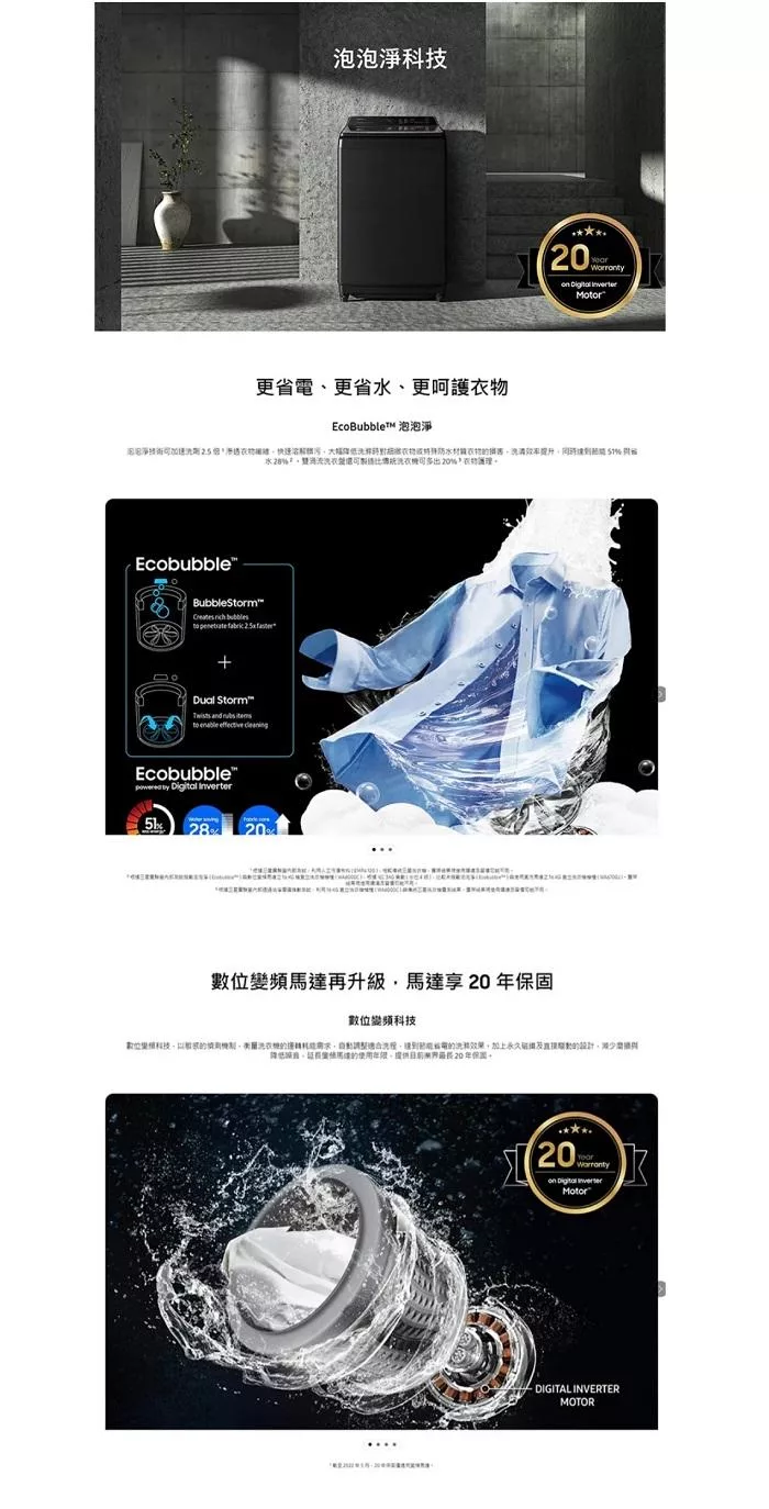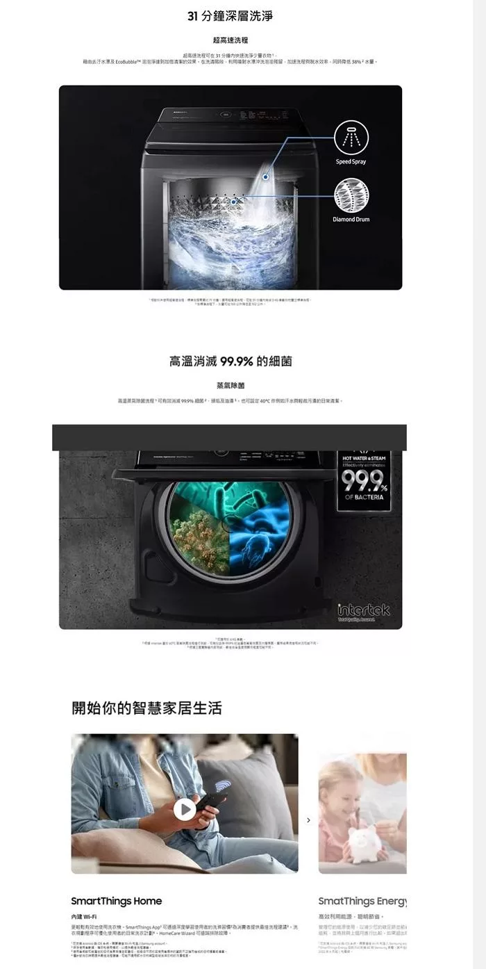 | 商品名稱 | SAMSUNG 三星 16公斤噴射雙潔淨直立式洗衣機 WA16CG6886BV/TW |