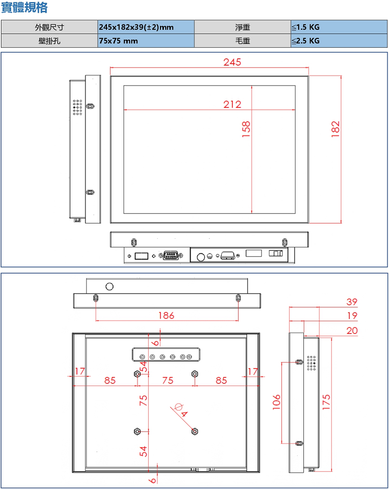 | 外觀尺寸(寬x高x厚)(mm) | 245x182x39 mm |
