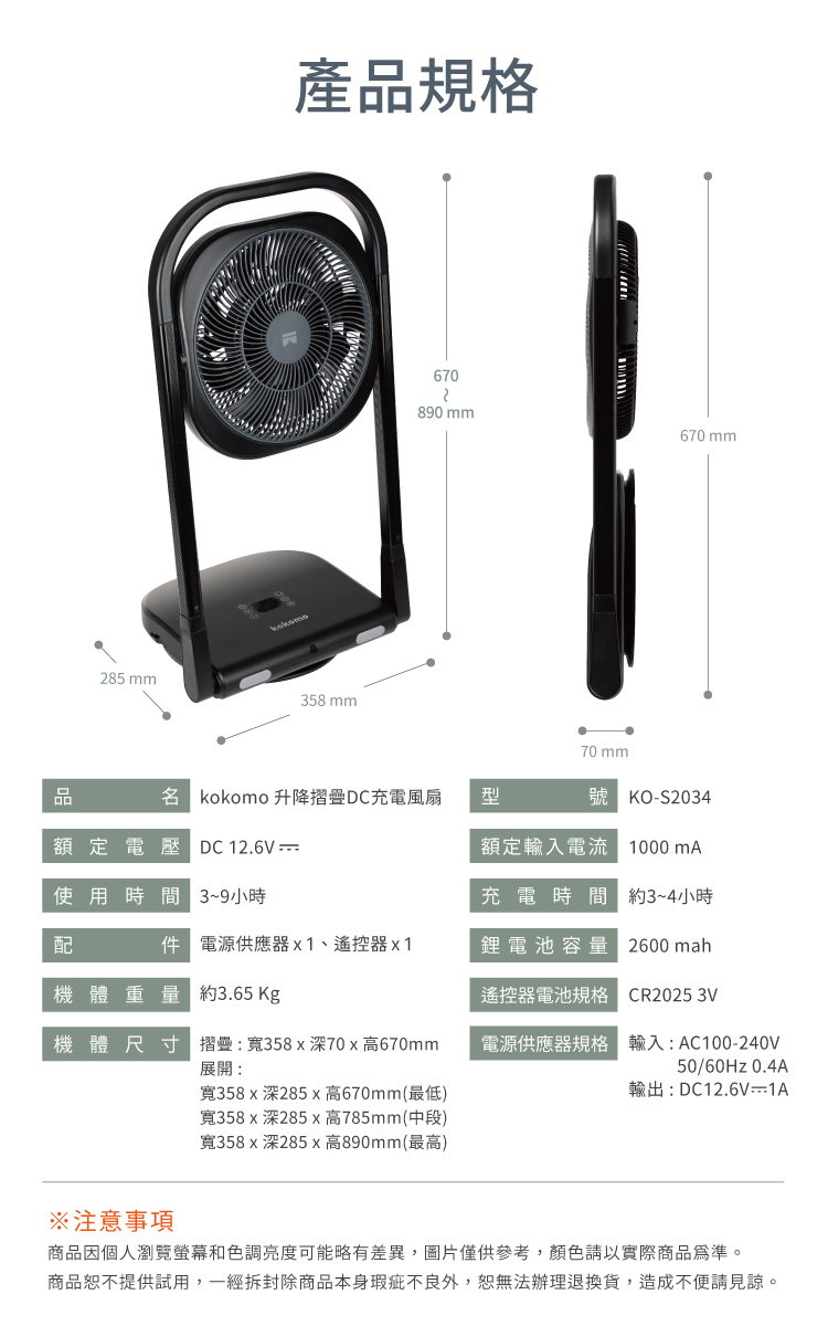 kokomo KO-S2034 8段調速12葉片以上12V充電式風扇 8.1~12吋尺寸長效8小時續航1年保固