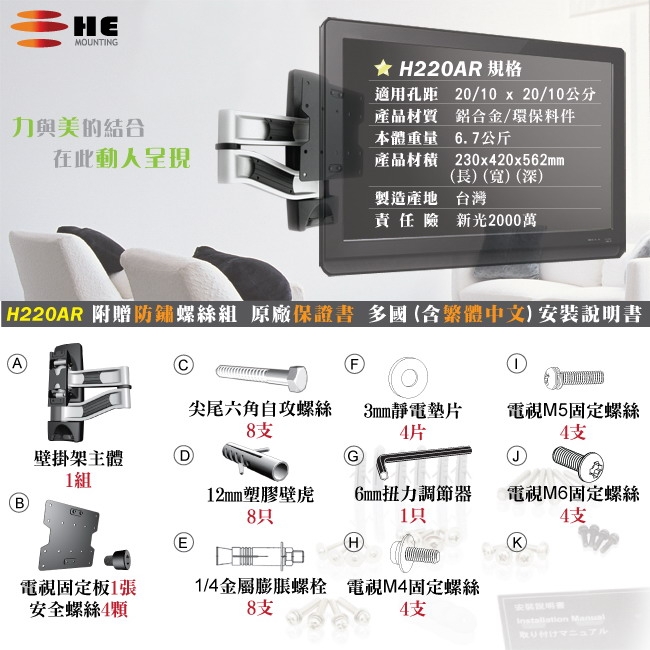| 螢幕螺絲 | M4, M5, M6 (產品內附) |