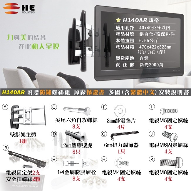 | 適用範圍 | 27吋, 30吋, 32吋, 37吋, 38吋, 39吋, 40吋, 42吋, 43吋, 46吋, 47吋, 48吋, 49吋, 50吋, 52吋, 55吋, 58吋, 60吋, 65吋, 70吋 |