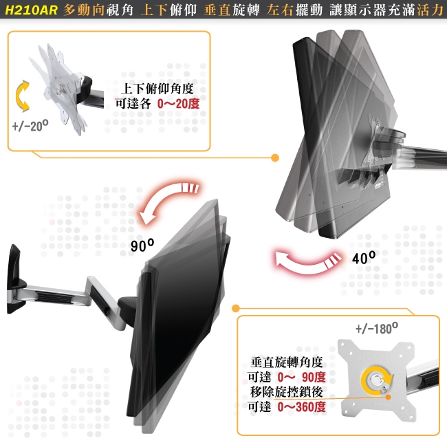 | 垂直旋轉 | 0~90度 自由調整 (卸除旋控鎖後可轉360度) |