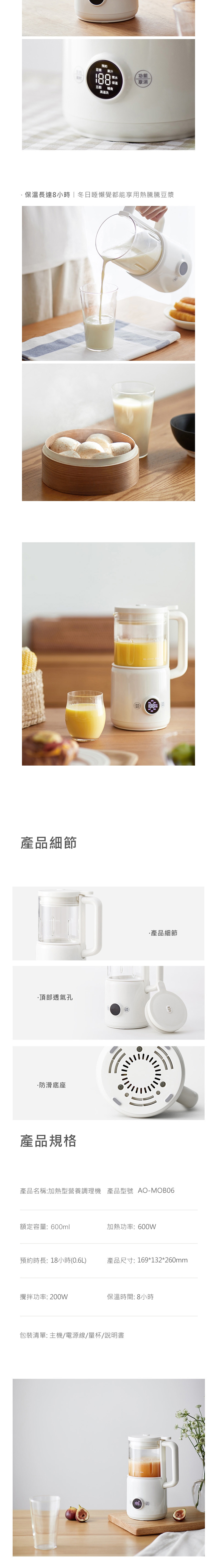 APIXINTL AO-MOB06 專業型調理機,採用高硼砂玻璃內部材質,耐熱耐用。支援20000~25000轉高轉速,適合製作果汁、湯品、豆漿等。具加熱特殊功能,消耗功率500~600W,容量1L以下,尺寸169x132x260mm,重量1.36kg。產地中國,電壓110V,保固1年,BSMI許可字號R56297。專業破壁調理,高效萃取營養,適閤家庭使用,提升廚房料理效率。