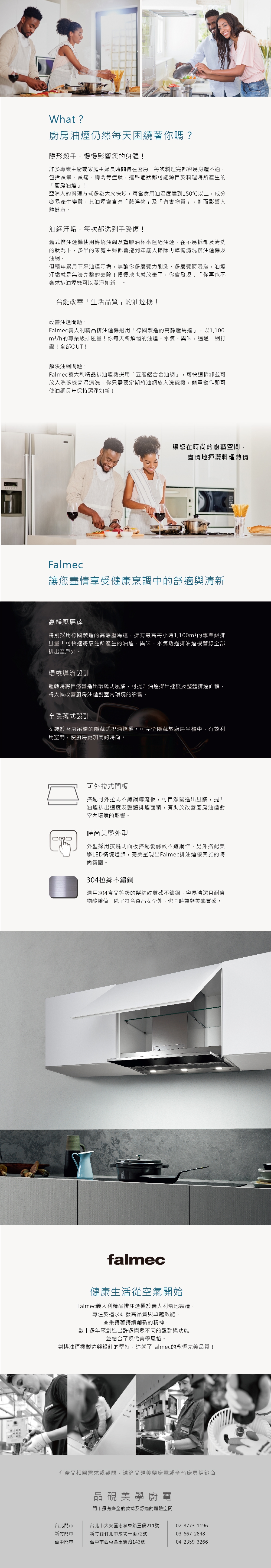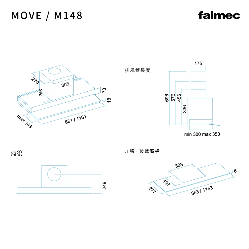 Falmec M148 隱藏式油煙機,歐洲進口不鏽鋼材質,86cm 寬度設計,電子式按鍵開關,4段風量調整,適用120V/60Hz電壓。BSMI認證R45336,1年保固,高效抽油煙不含安裝,完美適合現代廚房,提升廚房清潔與舒適。
