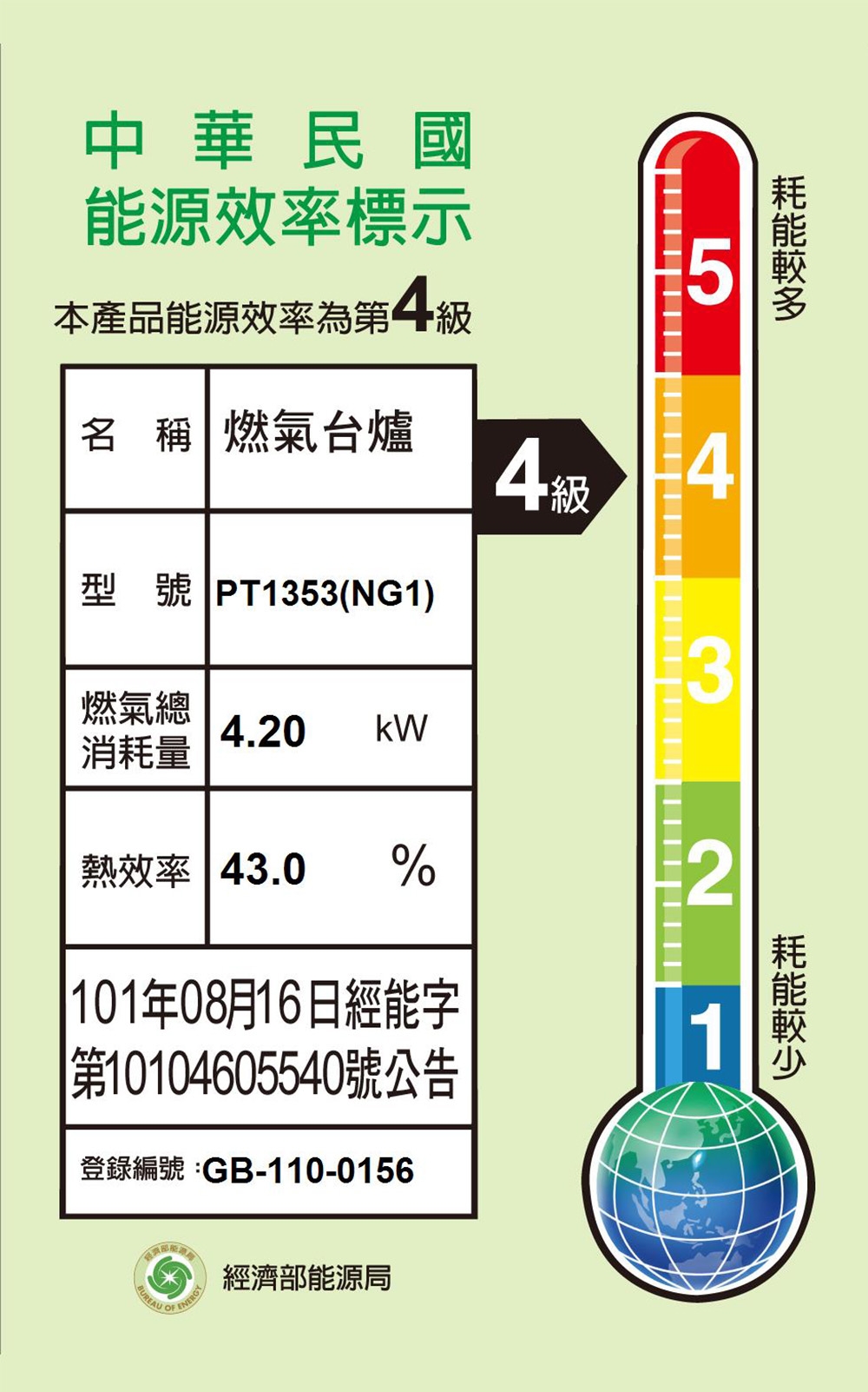 PITT PT1353 歐洲原裝進口單口瓦斯爐,採用耐用鑄鐵爐臺與純銅爐頭,配備雙炫火爐頭與左旋直轉式自動點火,尺寸35.3 x 50.3 x 9 cm,瓦斯消耗量4~5kW,能源效率第四級,含中式炒鍋架配件,BSMI許可T45336,1年保固,不含安裝,適閤中式料理高效加熱。