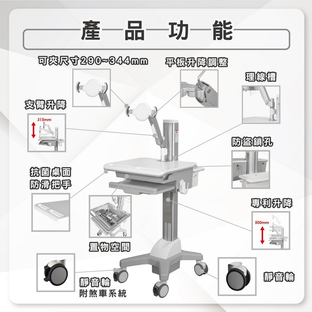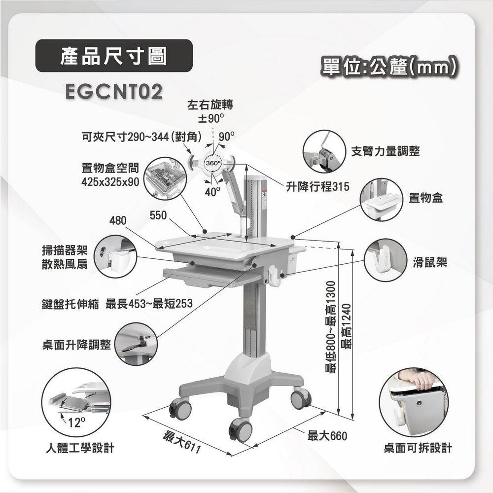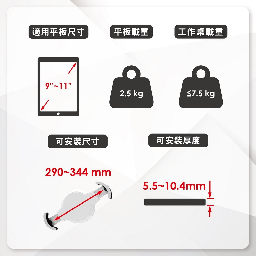 | 最大承重 | 桌面載重:≦7.5kg;螢幕載重:2.5kg |