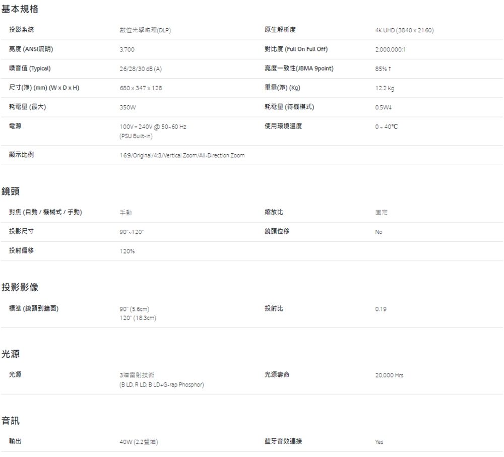 | 燈泡最大壽命(小時) | 20,000 Hrs |