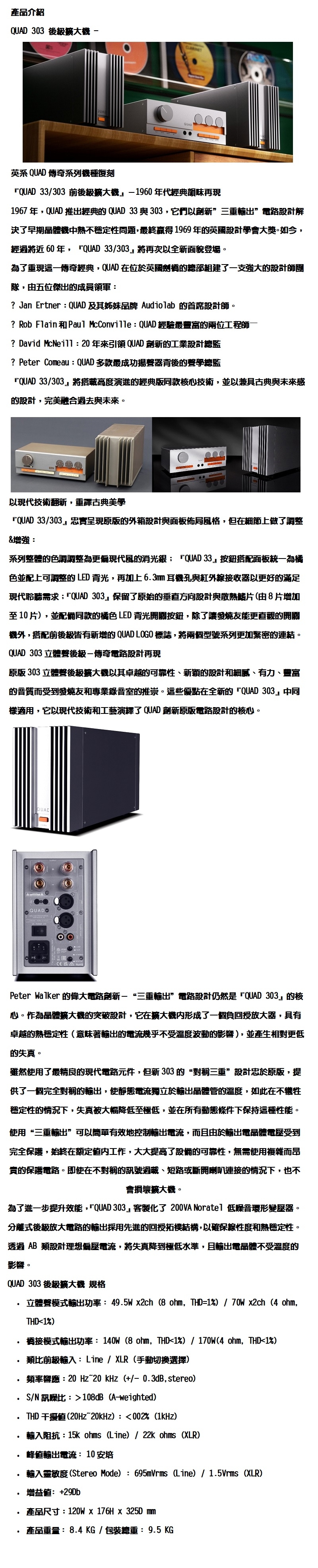QUAD 303 功率放大器,銀色系經典設計,適合立體聲音響系統。尺寸 120W x 176H x 325D mm,重量 8.4 KG,中國產地,支援 110V 電源,無 WiFi 及藍芽功能。BSMI 許可字號 R35819,提供 1 年保固,配件齊全。復古音響愛好者首選,帶來純淨音質體驗。