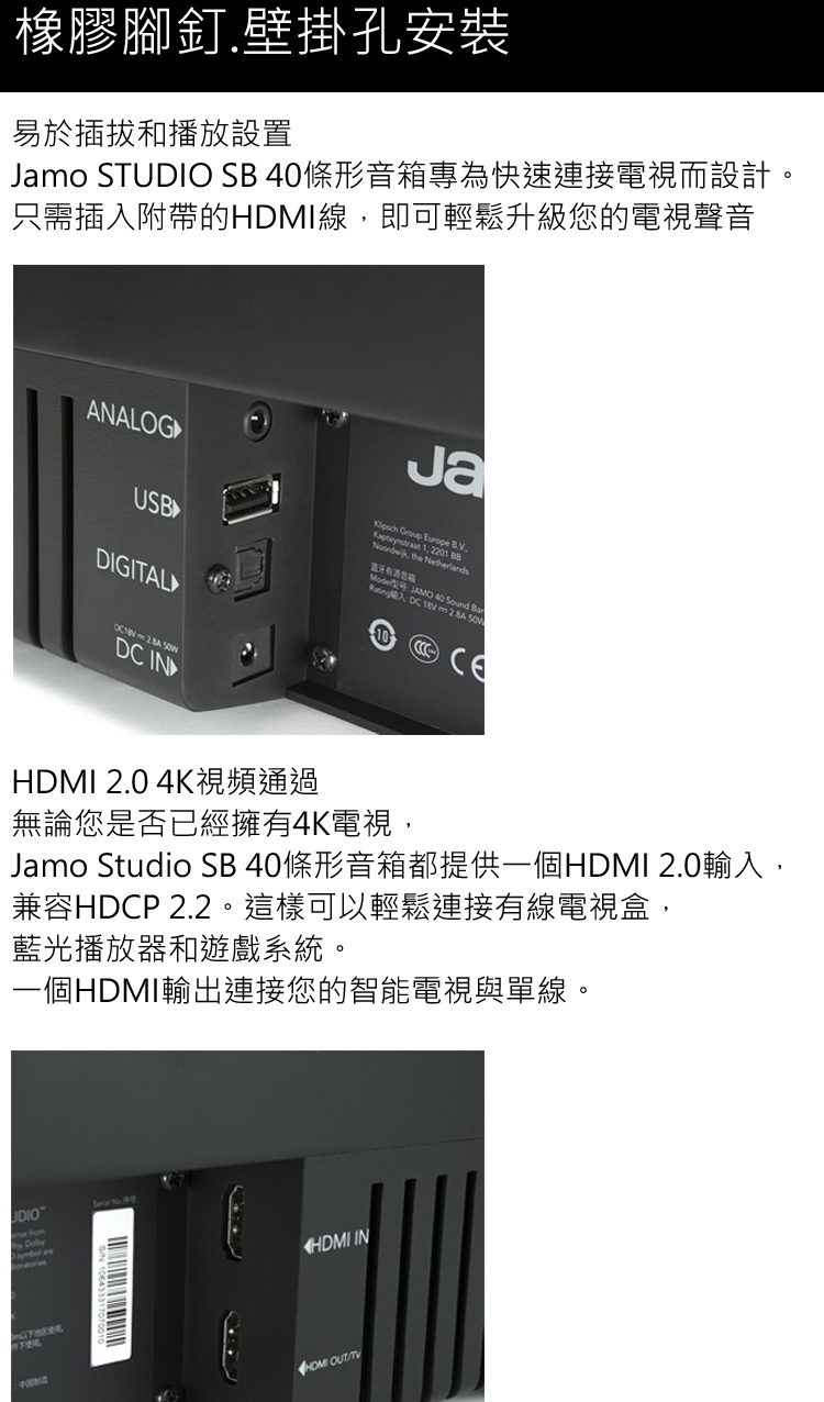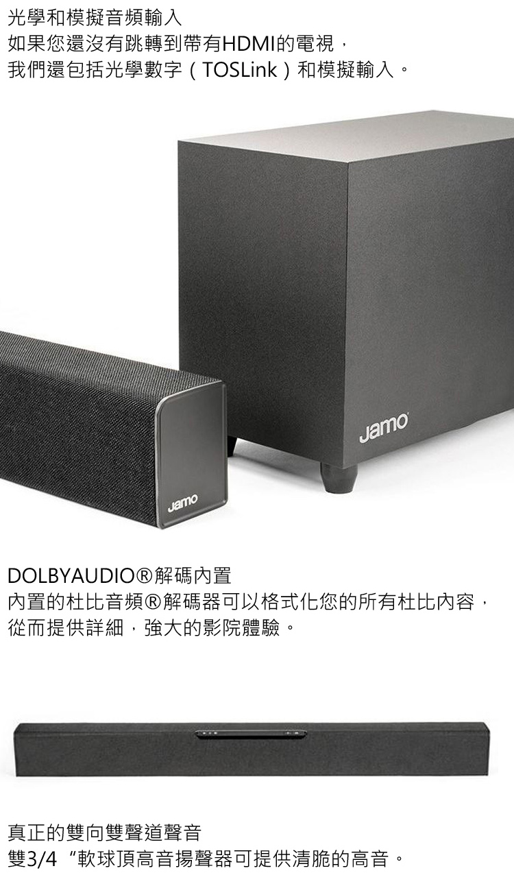 【JAMO】SB40 SoundBar(2.1聲道單件式環繞 SoundBar/光纖/HDMI 2.0 4K訊號直通/虛擬環繞/公司貨)