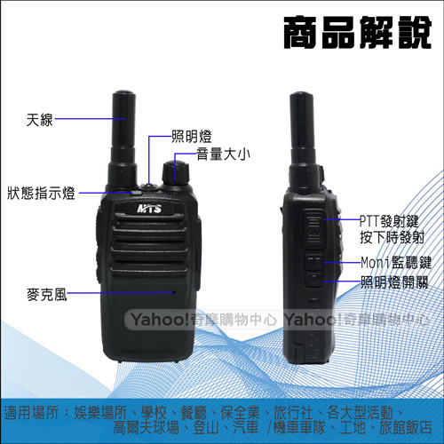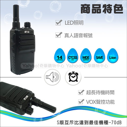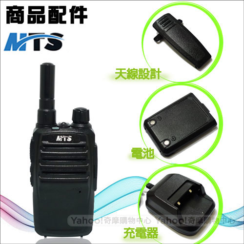 | 配件 | 對講機主機x2、耳機麥克風x2、1100mAh鋰電池x2、原廠天線x2、充電座x2、原廠背夾x2、中文說明書x2 |