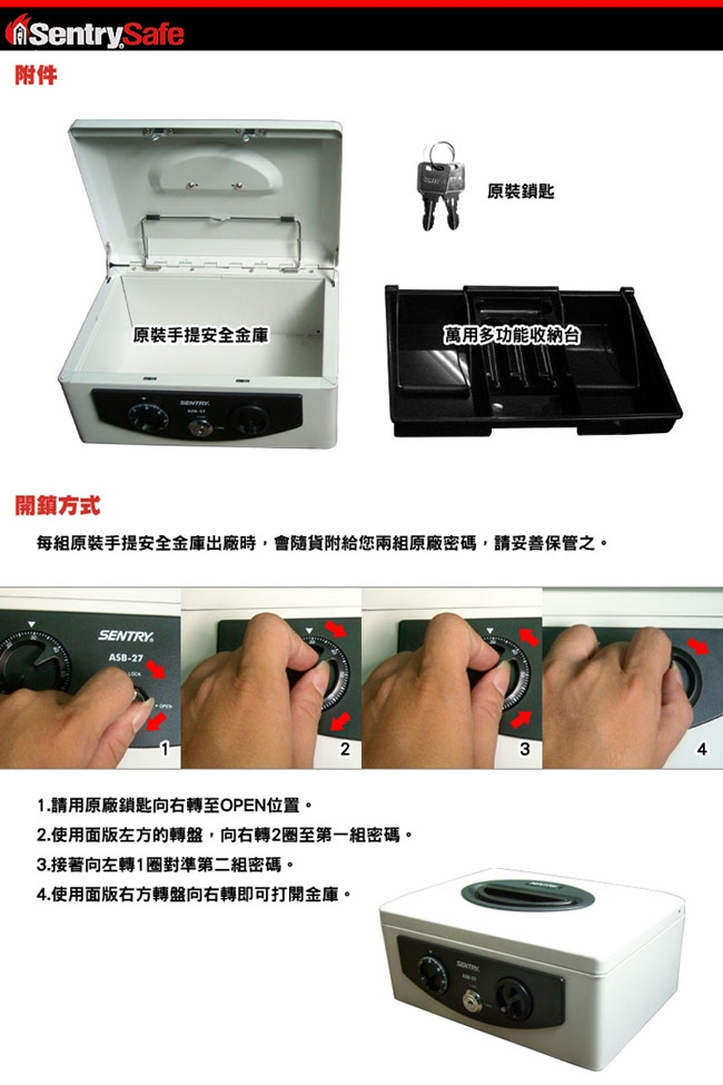 | 內容物 | 1.手提安全金庫x1 2.現金收納盤x1 3.原廠鑰匙x2 |