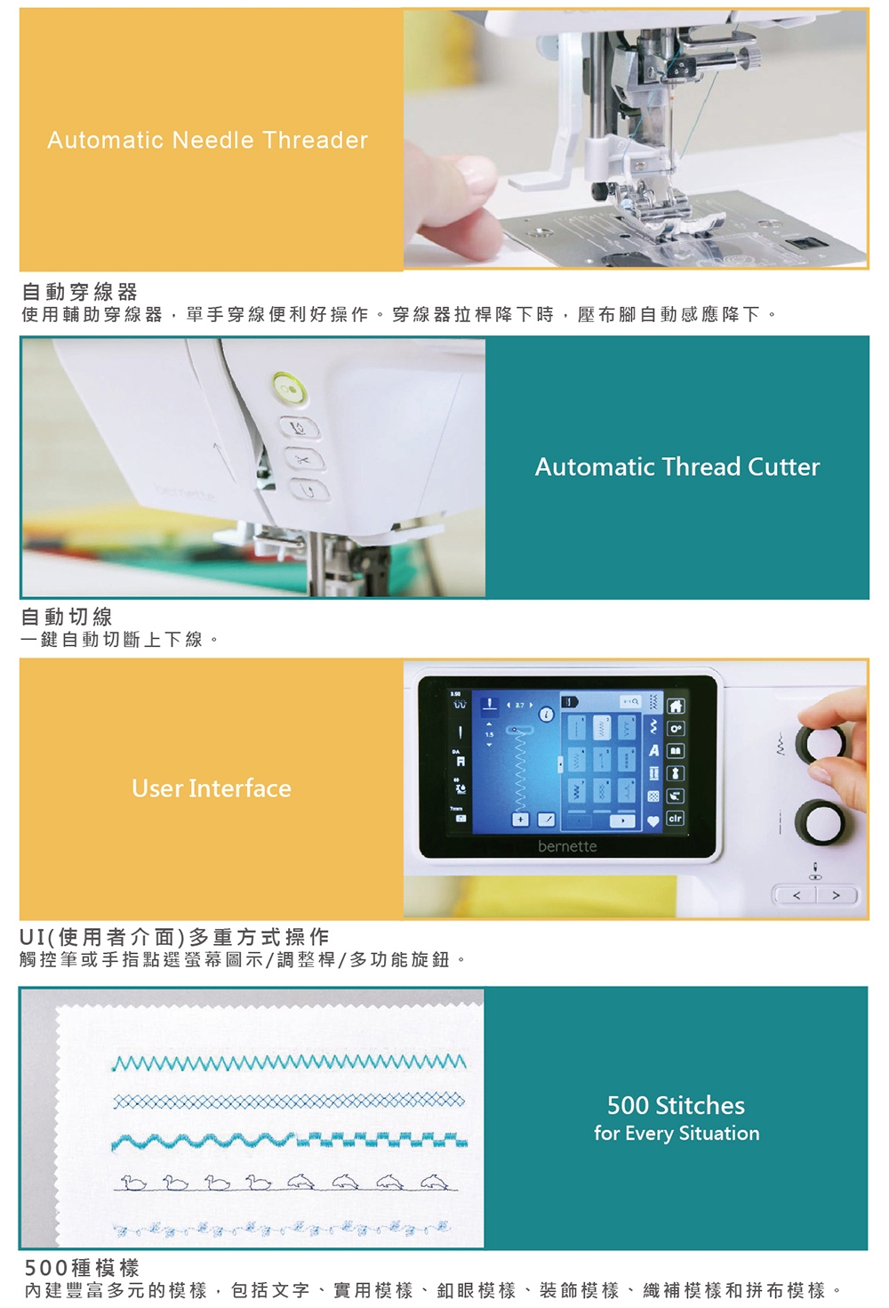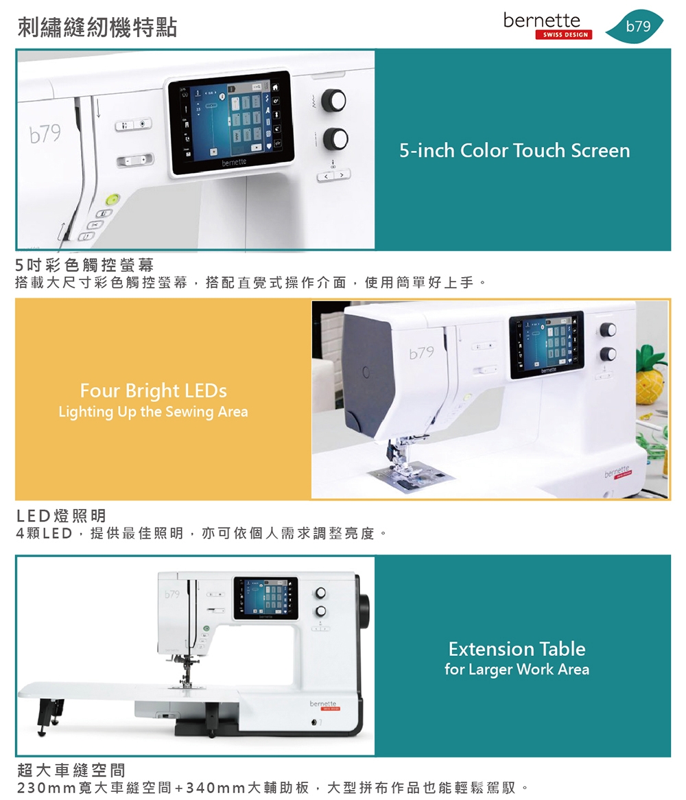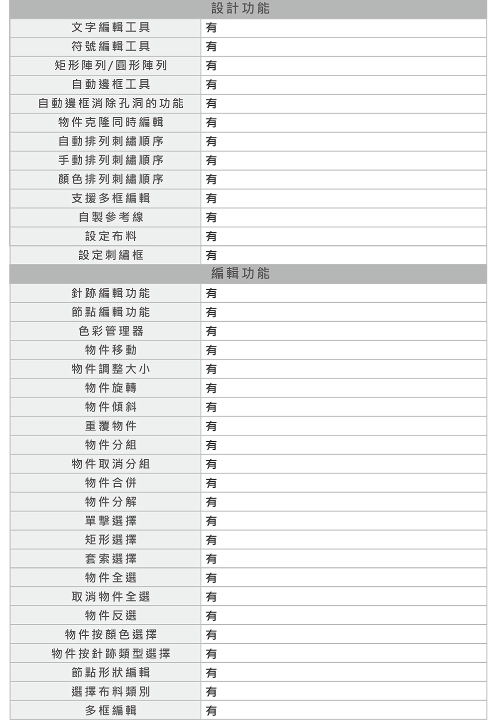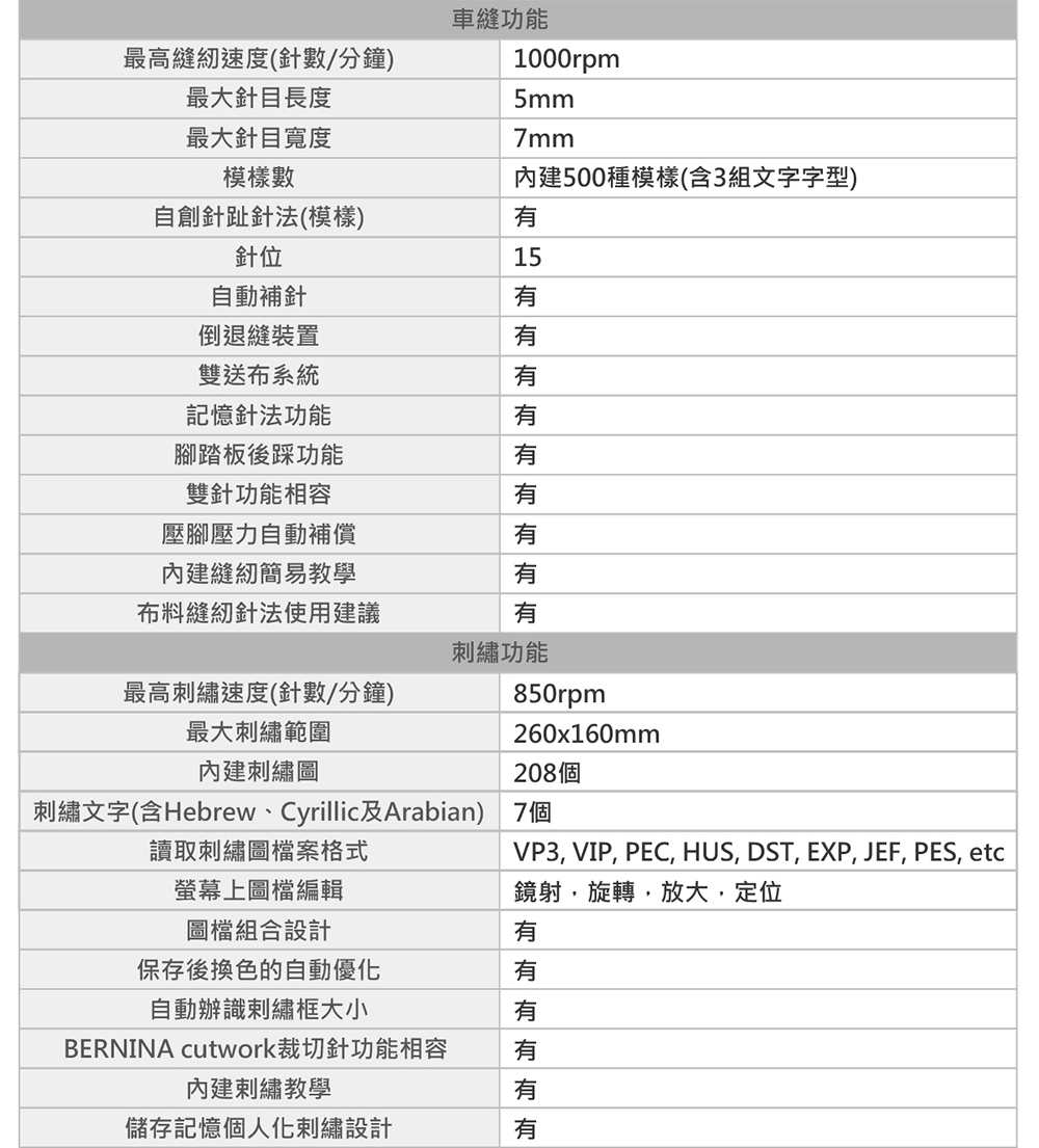 | 特殊功能 | 刺繡功能, LED觸碰式螢幕顯示, 自動穿線功能 |
