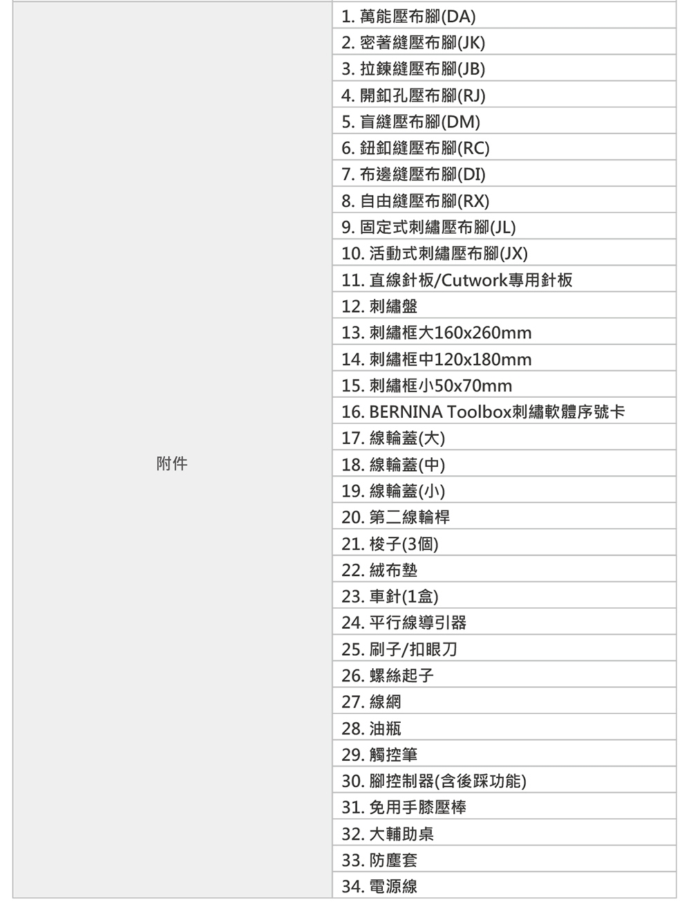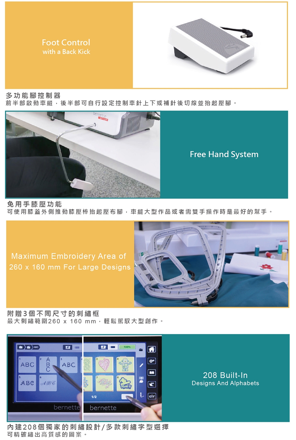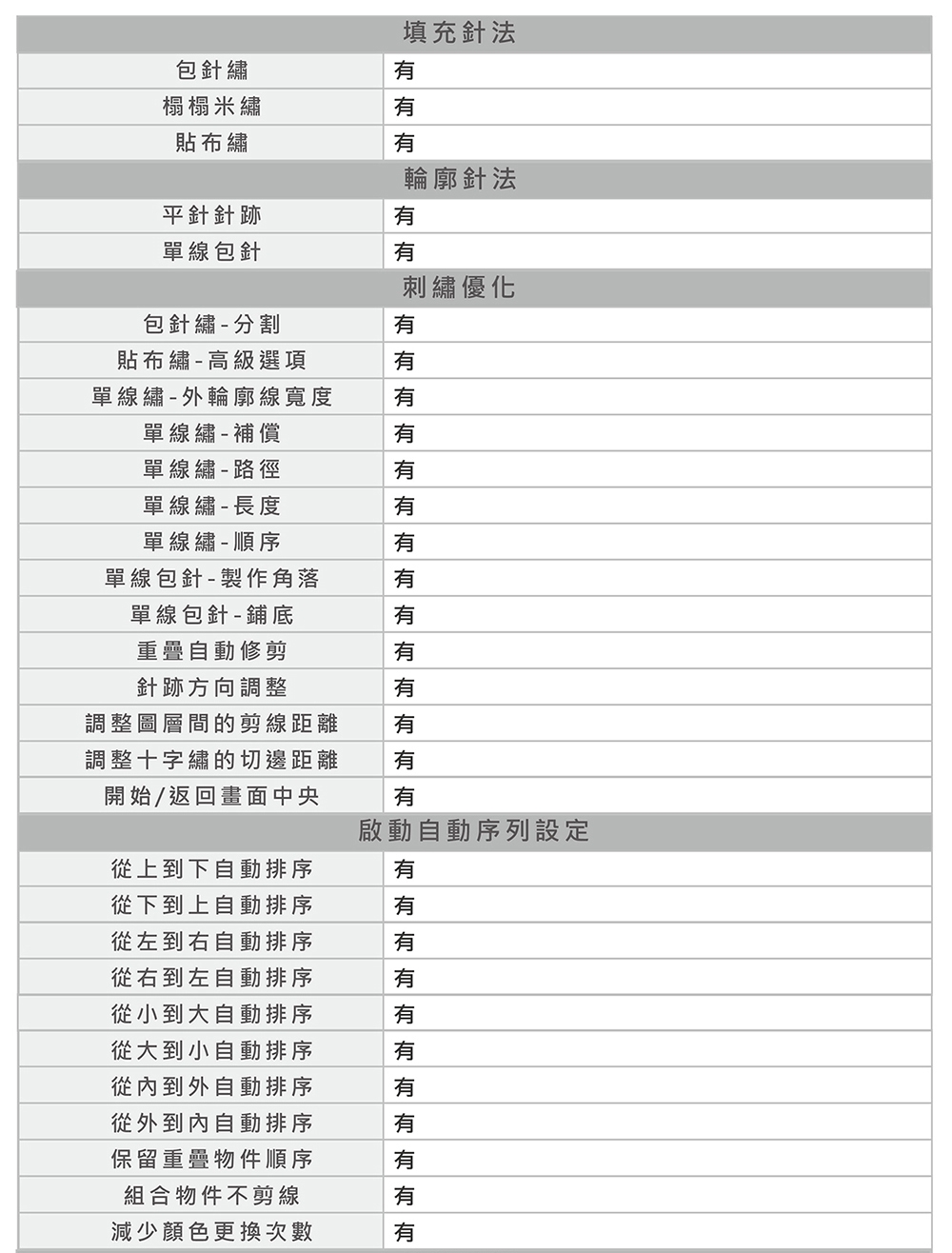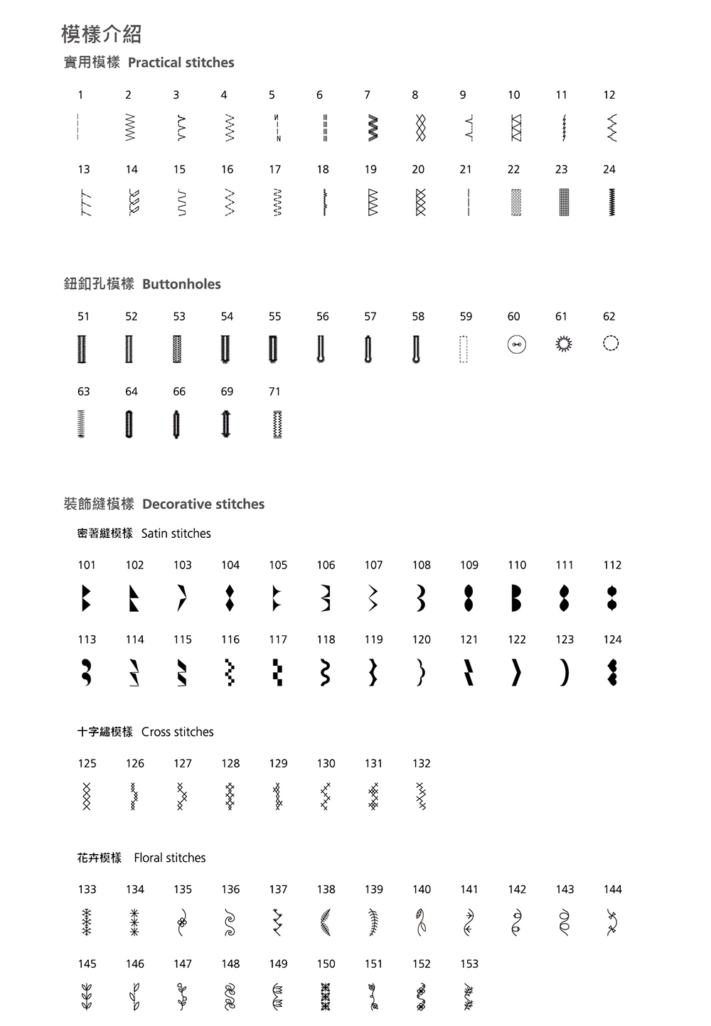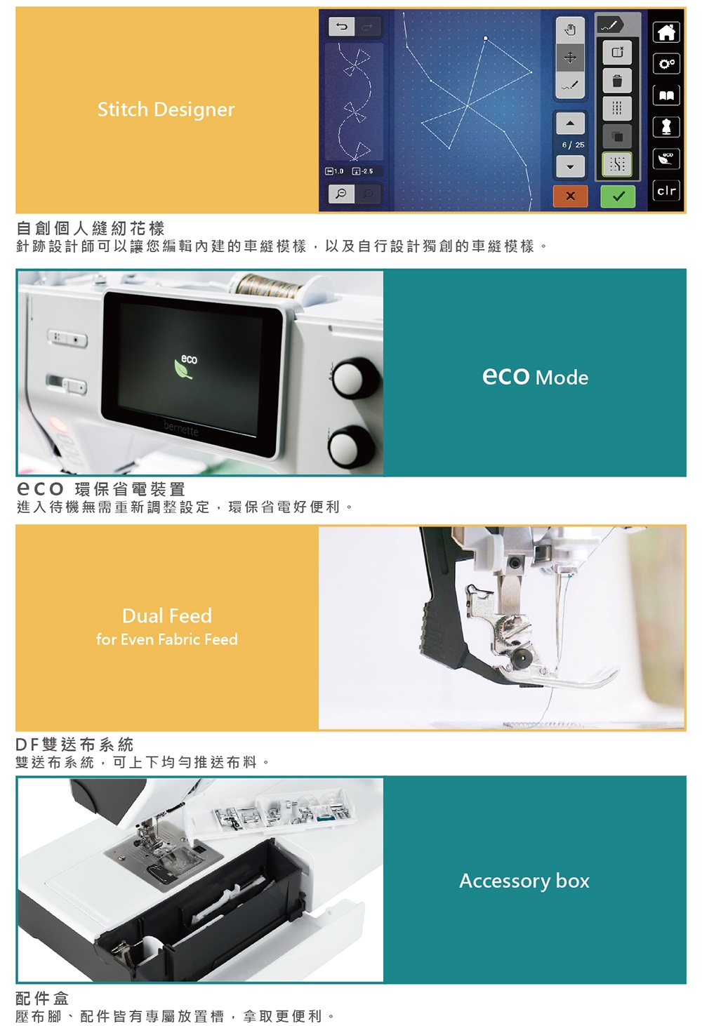 | 特殊功能 | 刺繡功能, LED觸碰式螢幕顯示, 自動穿線功能 |