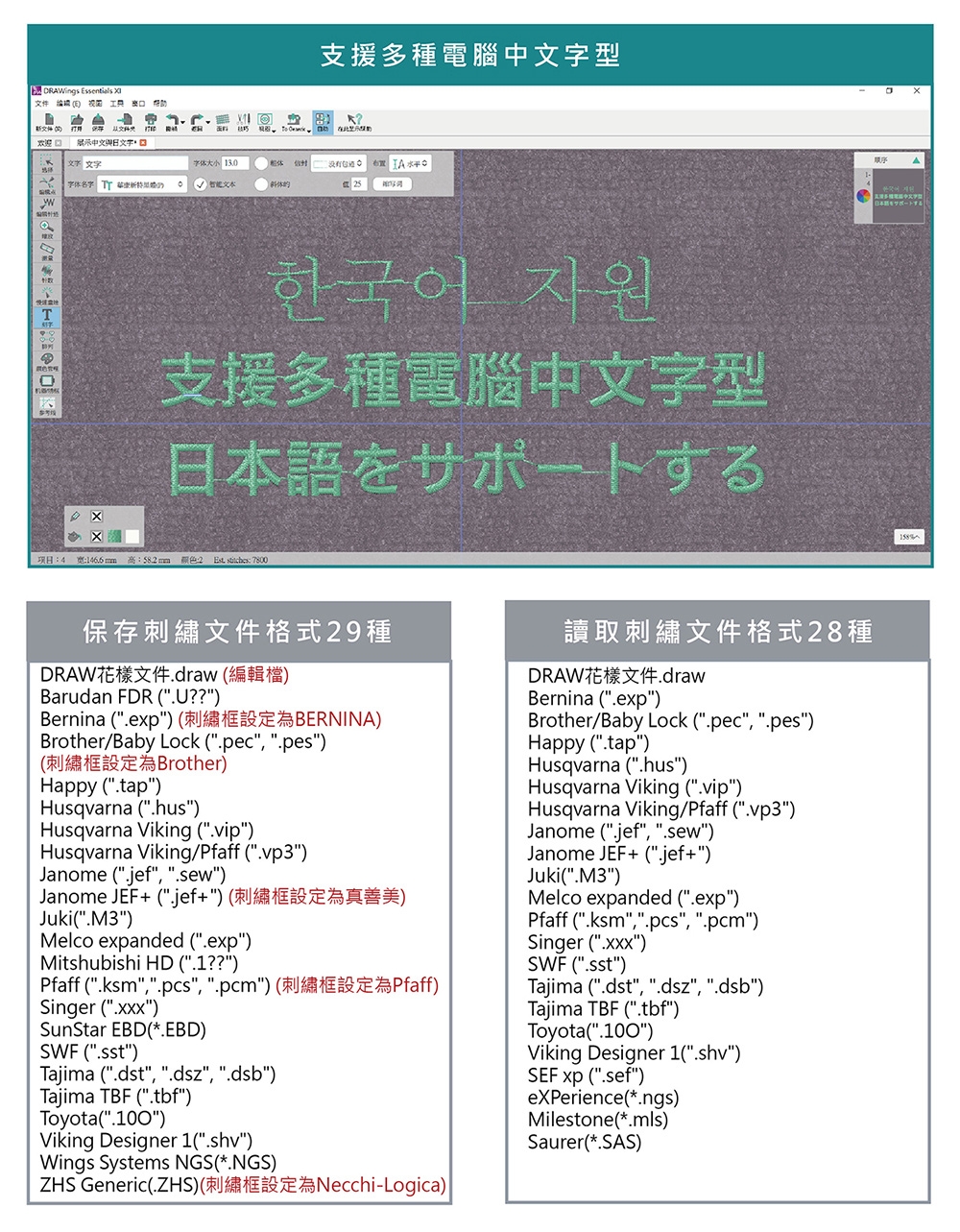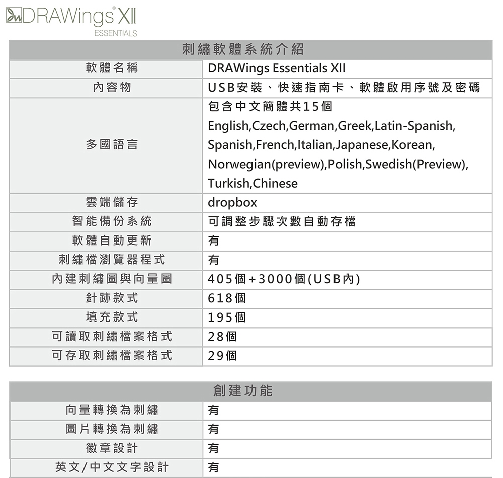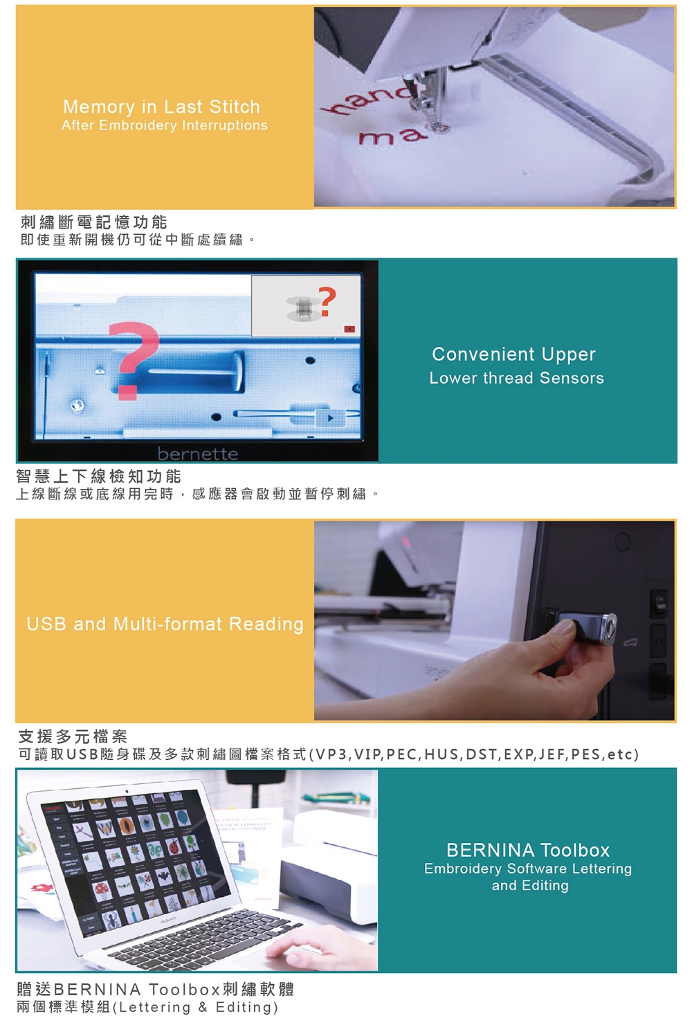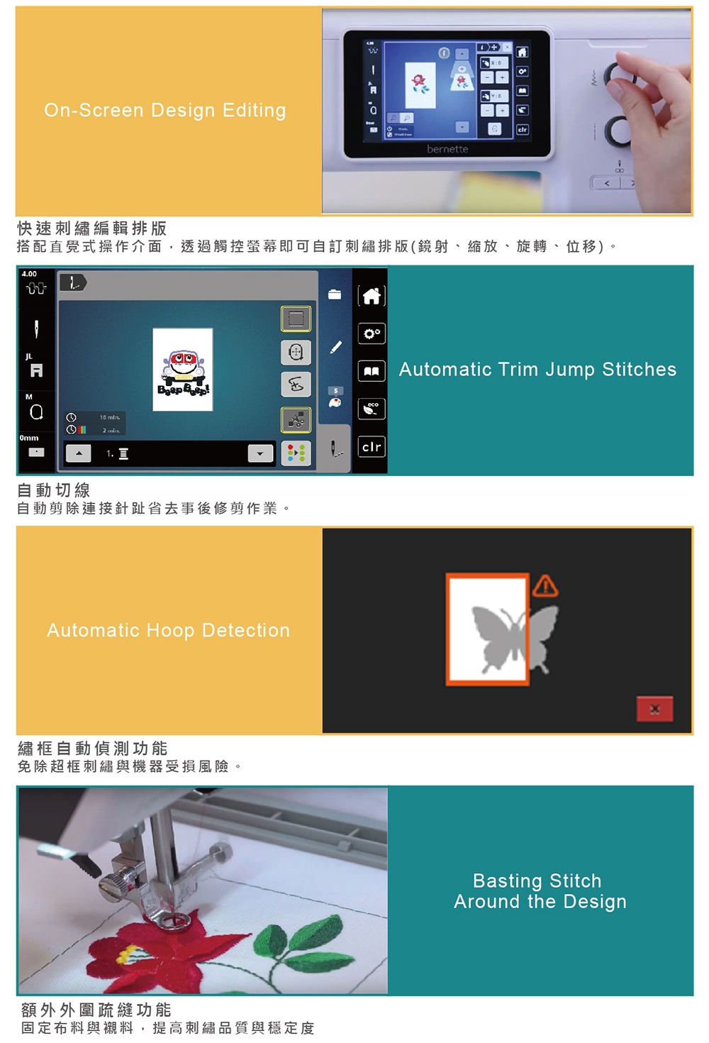 | 特殊功能 | 刺繡功能, LED觸碰式螢幕顯示, 自動穿線功能 |