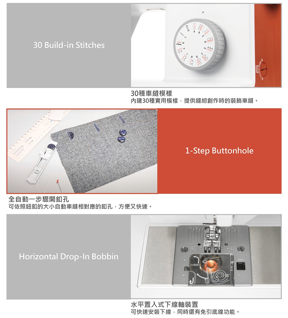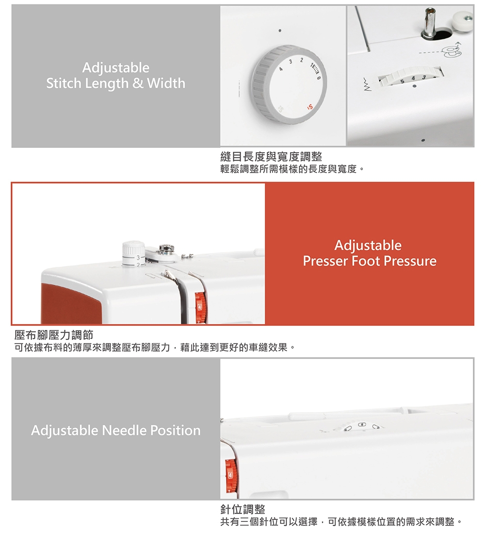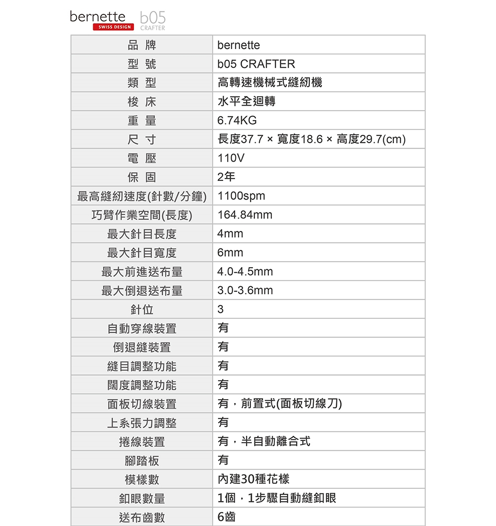 bernette b05 CRAFTER 是一款中國製機械型家用縫紉機,採用水平式全迴轉梭床設計,縫紉速度最高達700針/分以上,適合初學者與進階使用者。具備自動穿線功能,針趾幅度及長度均調整至0~7mm以下,提供精準縫製體驗。機身尺寸長37.7 × 寬18.6 × 高29.7 cm,淨重僅6.74 kg,輕巧易攜,適用110V電壓,並享有2年保固。配件詳見說明,完美解決日常縫紉需求,提升創作效率。