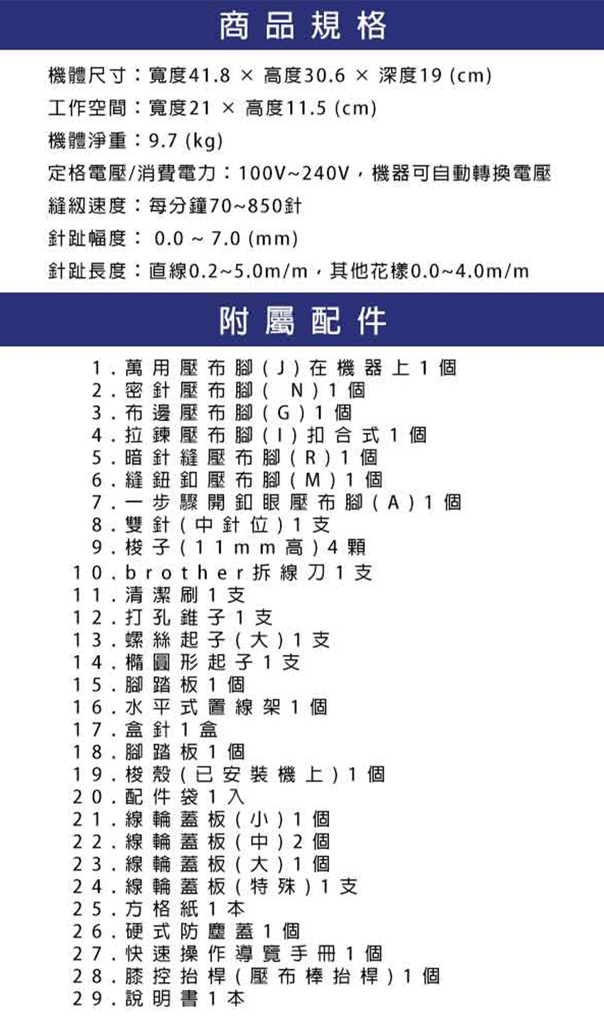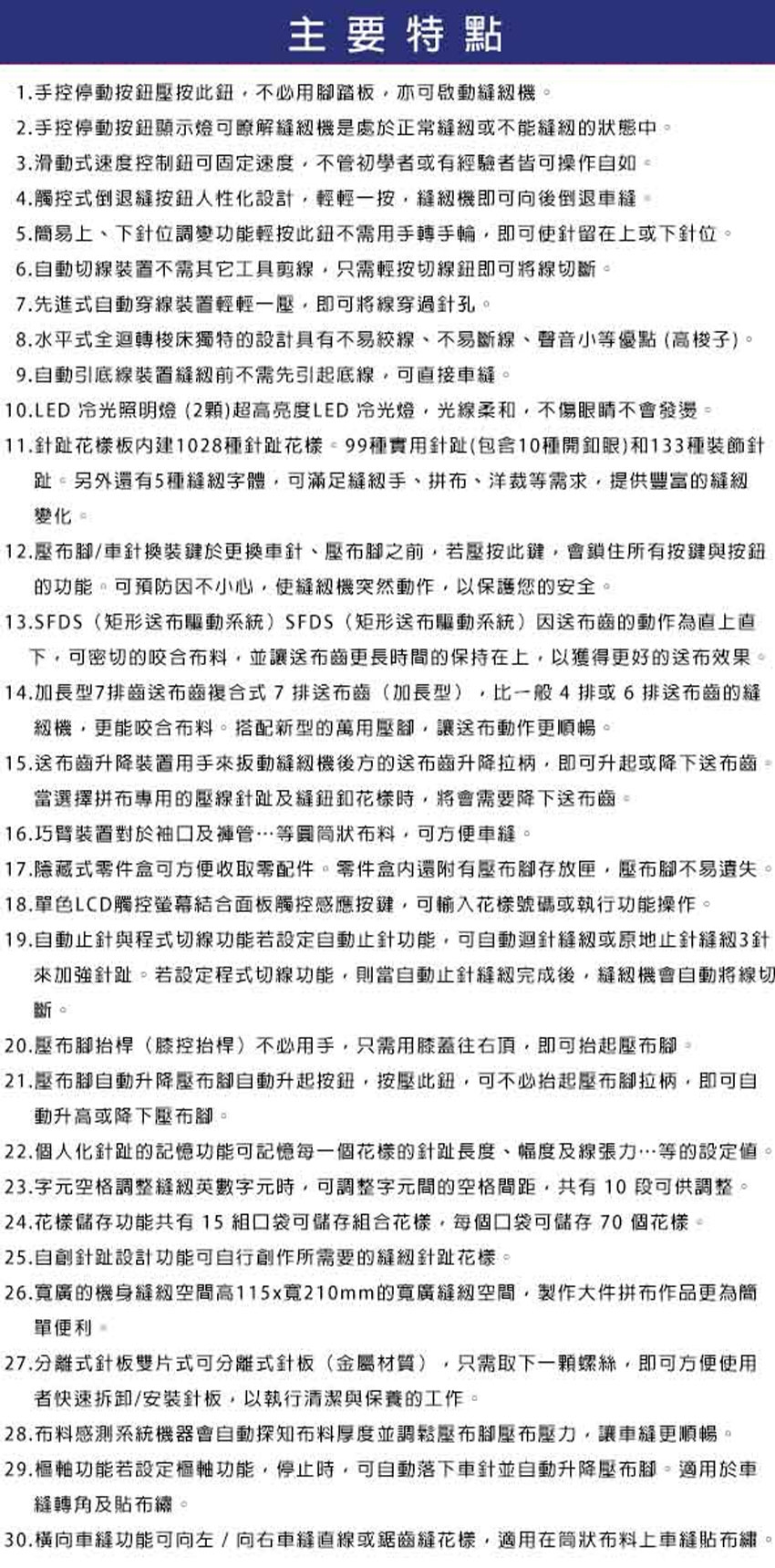 | 特殊功能 | LED觸碰式螢幕顯示, 自動穿線功能 |